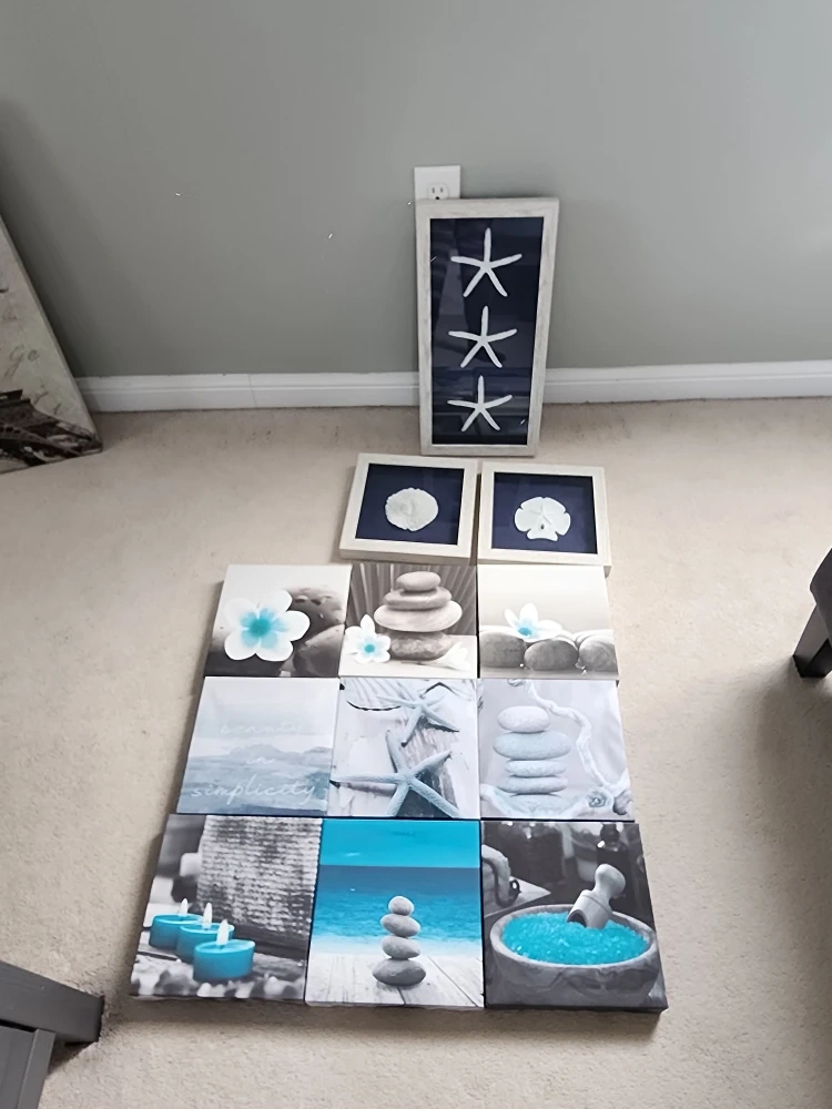 This set includes 12 square canvas prints featuring soothing spa and beach themes. Images include balanced stones, seashells, starfish, flowers, and ocean scenes. It's a great collection to create a relaxing atmosphere.