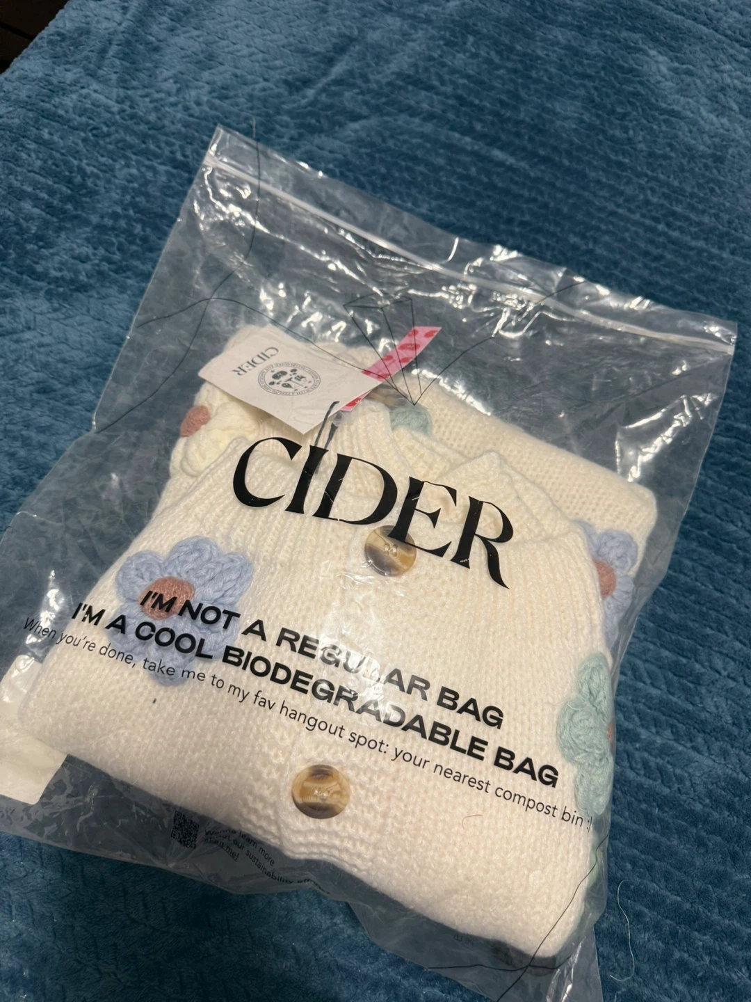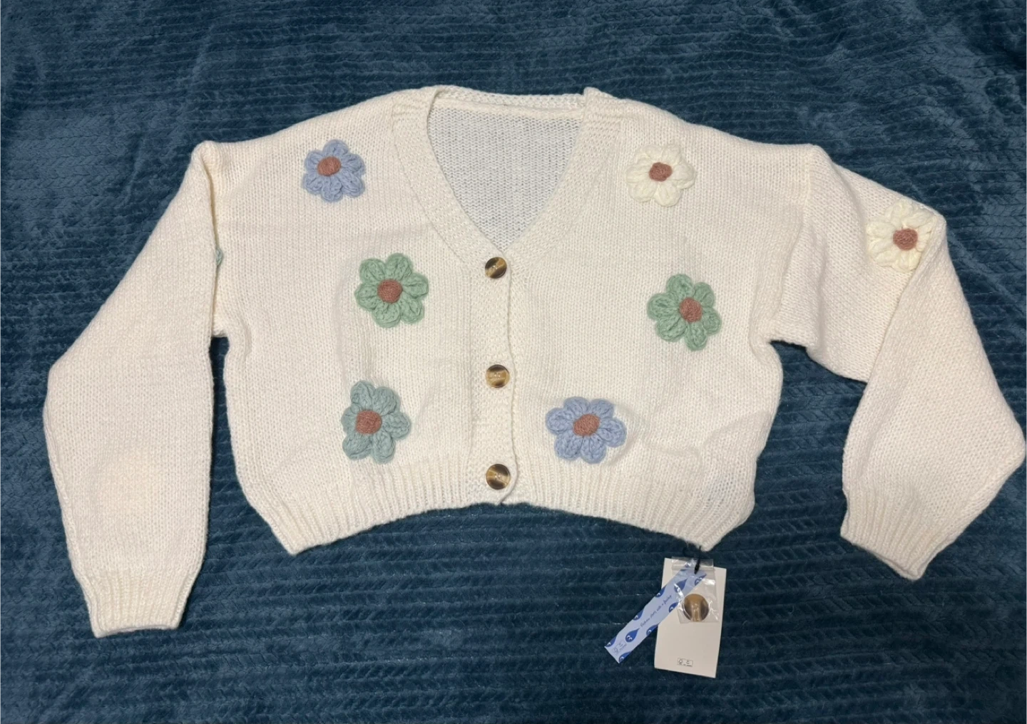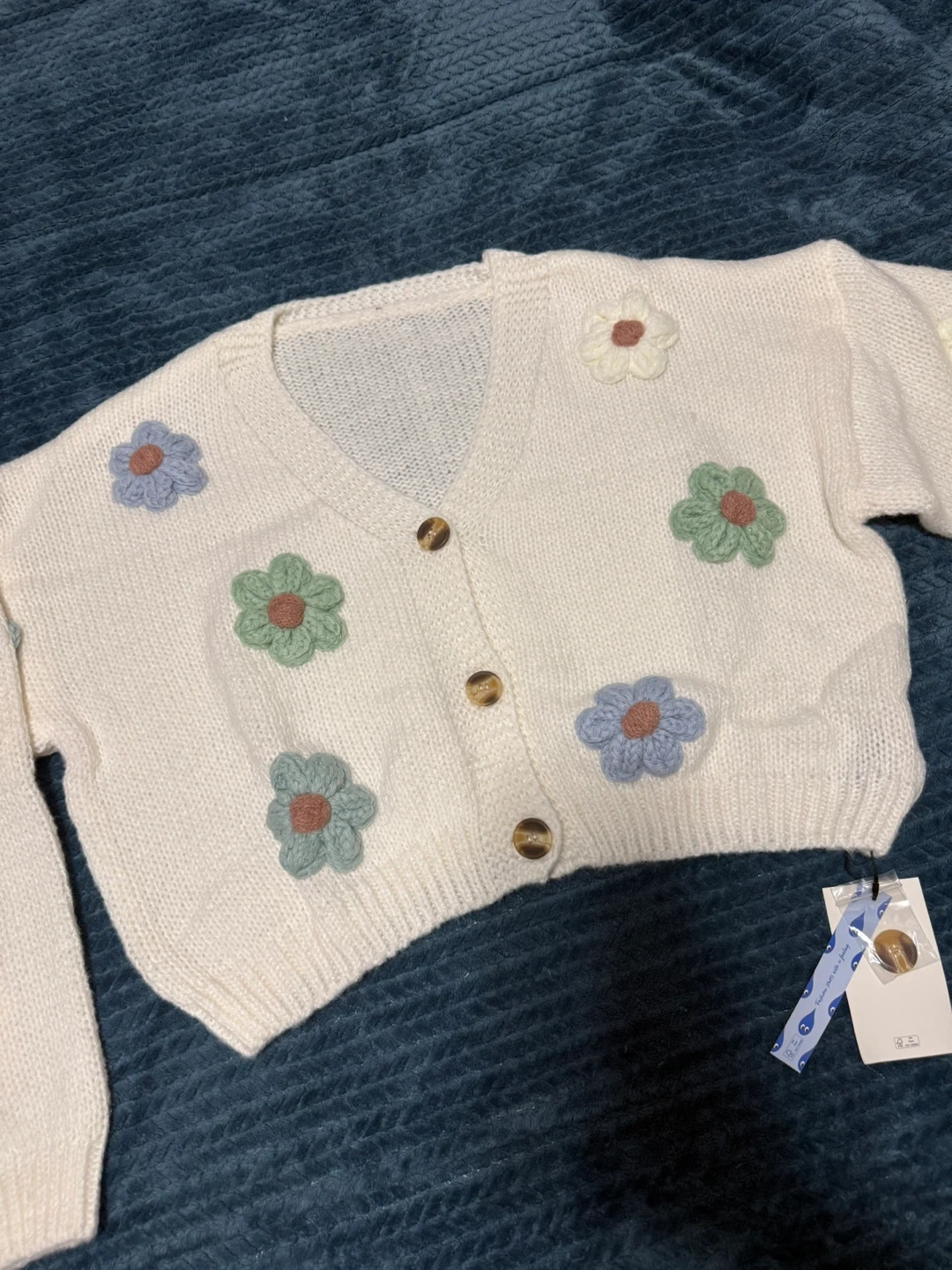 Cream knit cardigan featuring colorful floral appliques. It's a cropped style with a V-neck and button-up front. Made of a cozy knit material.