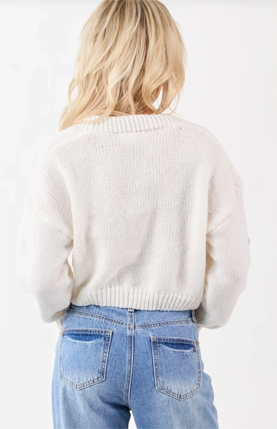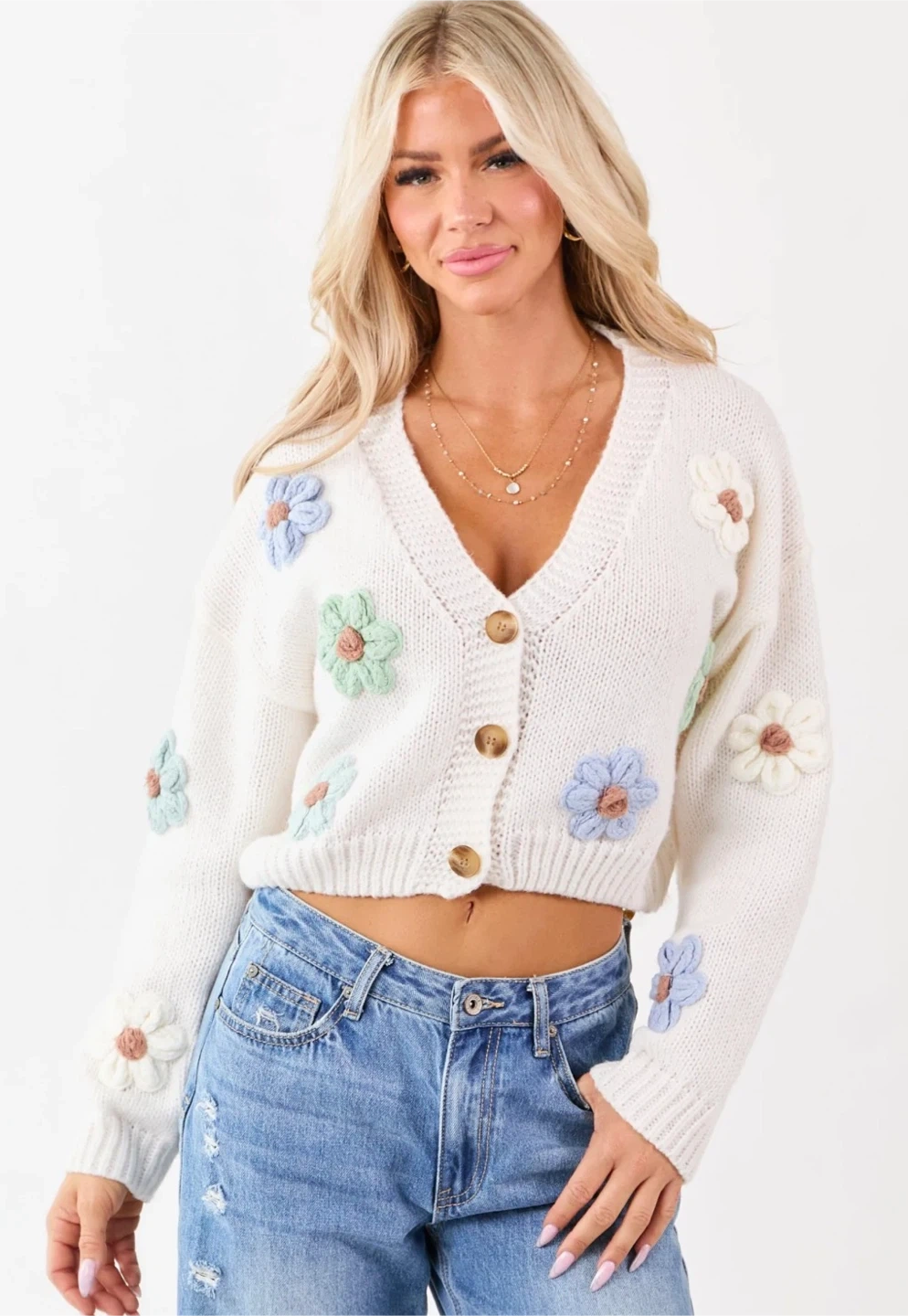 Cream knit cardigan featuring colorful floral appliques. It's a cropped style with a V-neck and button-up front. Made of a cozy knit material.