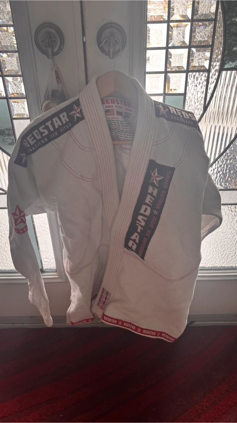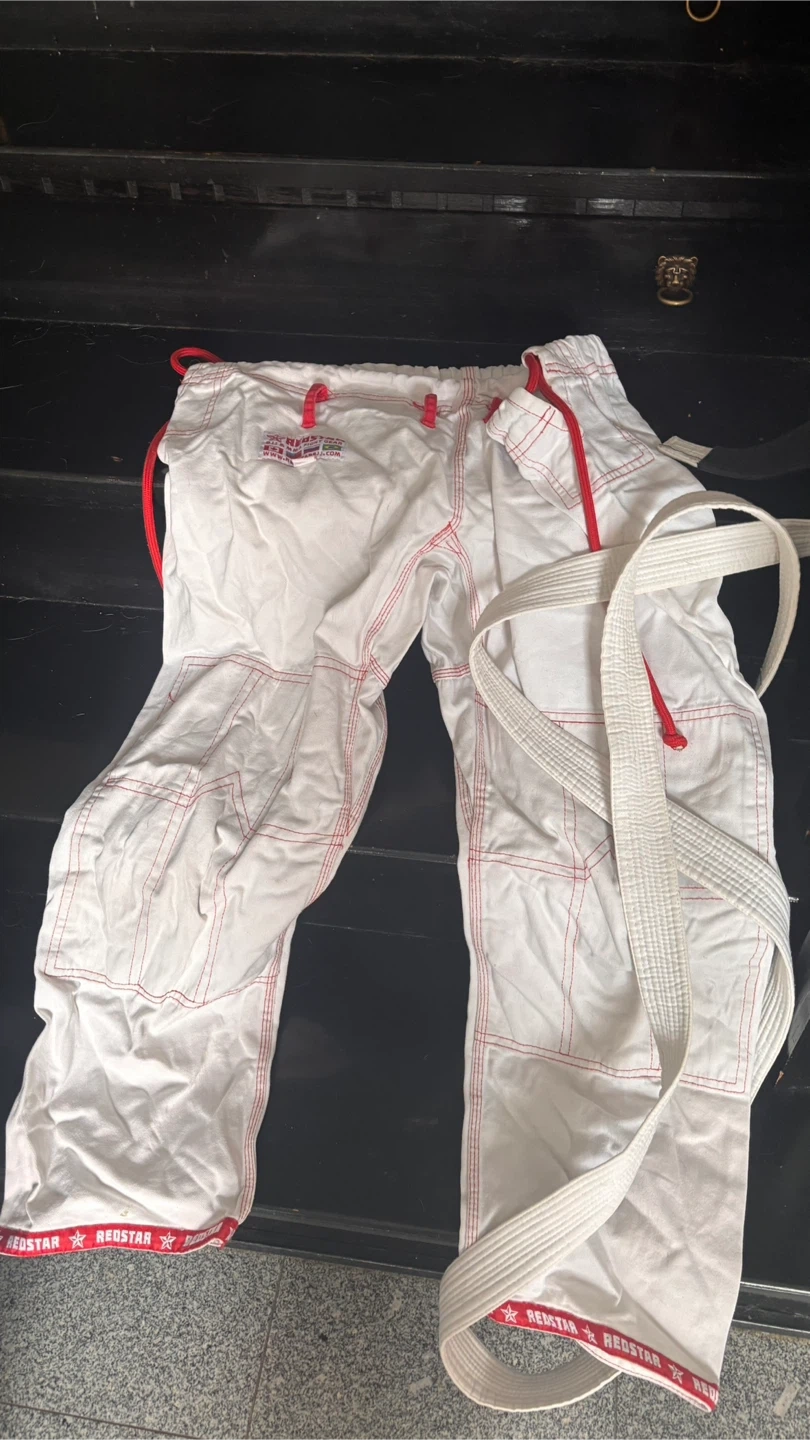 This is a Redstar Brazilian Jiu Jitsu Gi and belt. It's white with red stitching and features multiple brand patches. Includes a white belt. Ready for training!