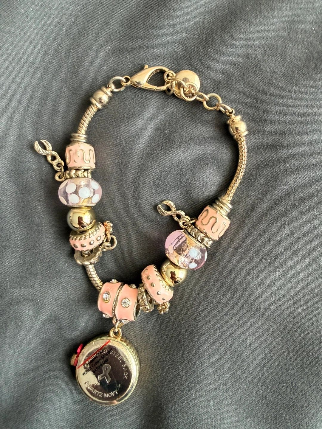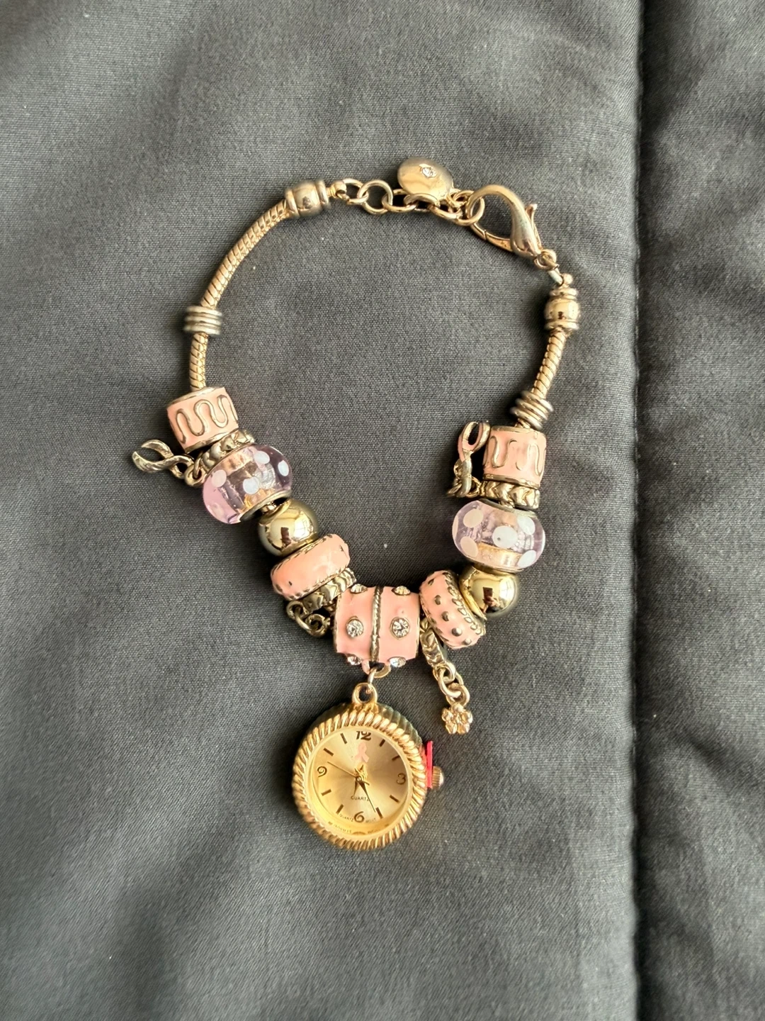 This is a gold-tone charm bracelet featuring pink and clear glass beads, gold-tone charms, and a small gold-tone watch. It's a stylish accessory with a unique timepiece. It fastens with a lobster clasp.