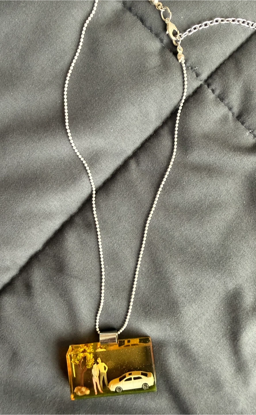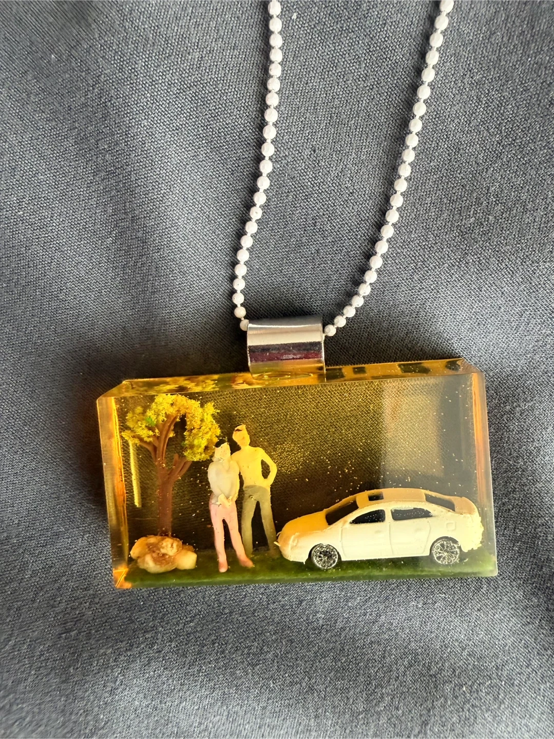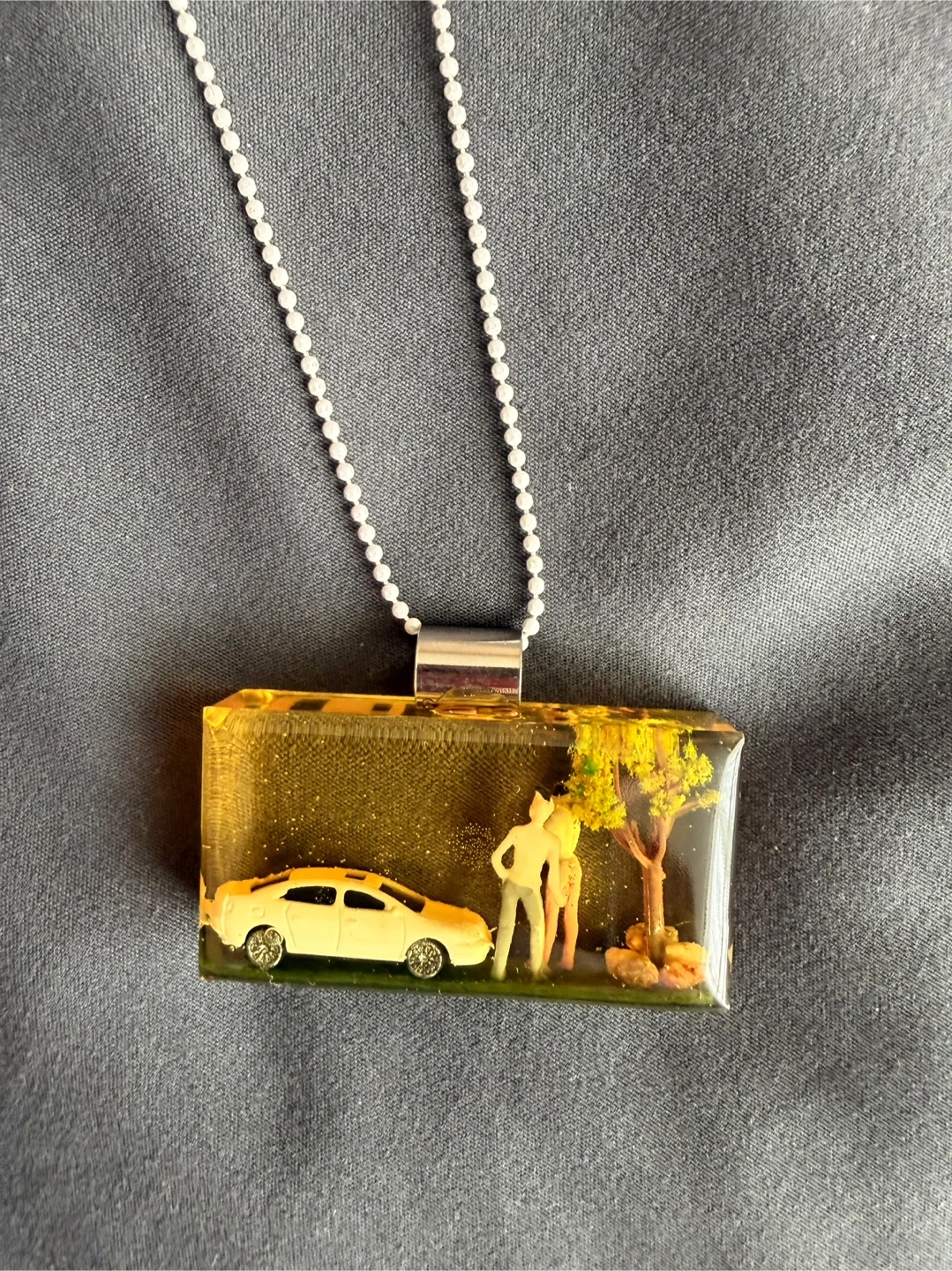 A unique pendant necklace featuring a miniature scene encased in resin. It shows a couple and a car under a tree. The necklace comes with a silver ball chain.