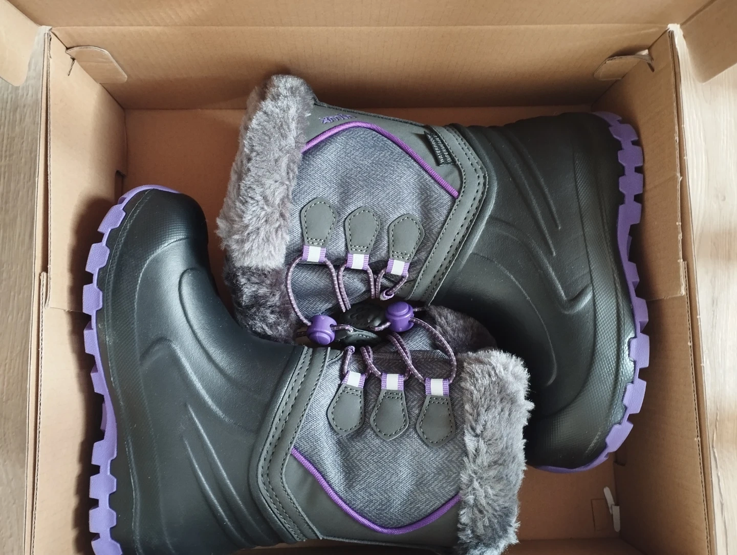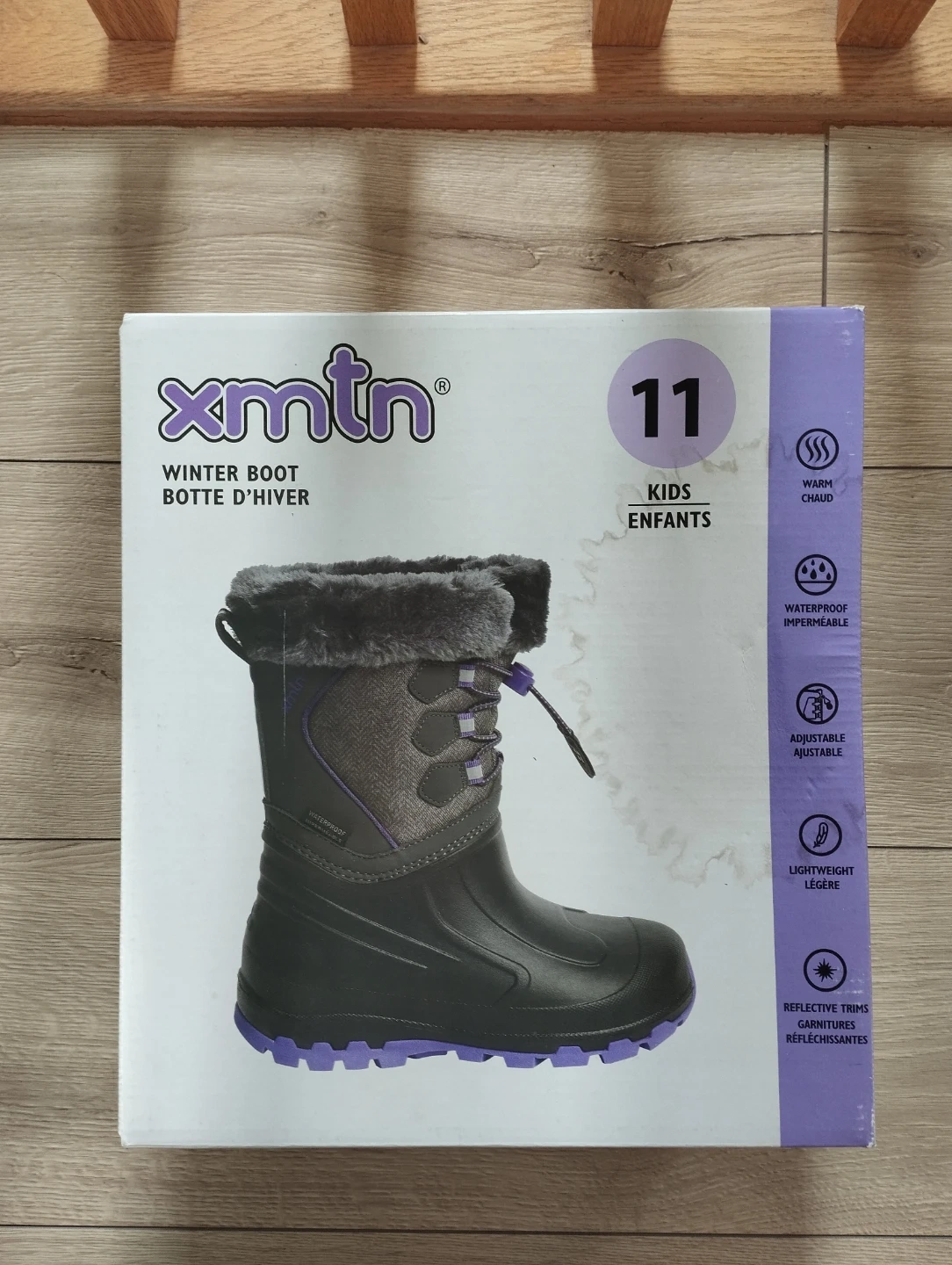 XMTN kids' winter boots in size 11. These warm, waterproof boots feature adjustable toggles and reflective trims.