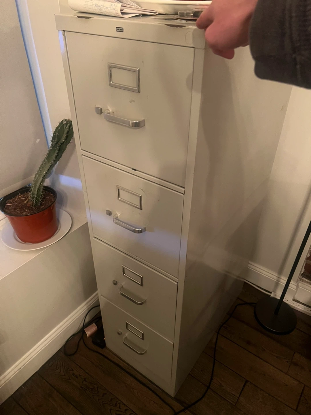 This is a four-drawer metal filing cabinet in a neutral color. It has standard pull handles and label holders on each drawer. It's a durable storage solution for offices or homes. Its construction is sturdy metal. I’m moving so needs to be gone by the end of the week
