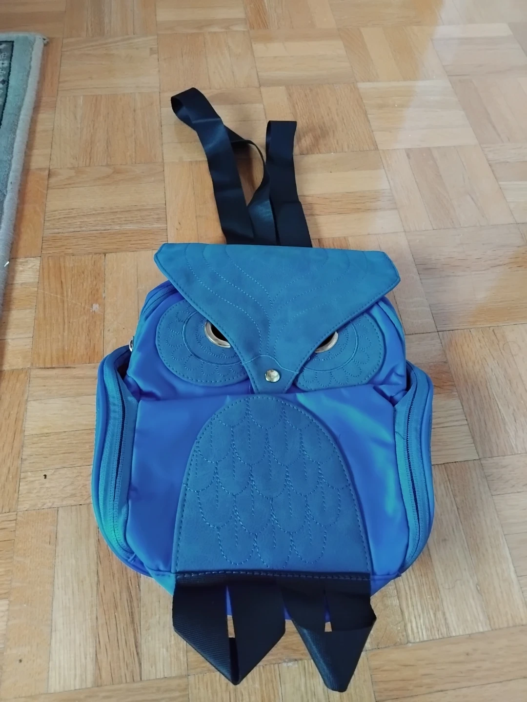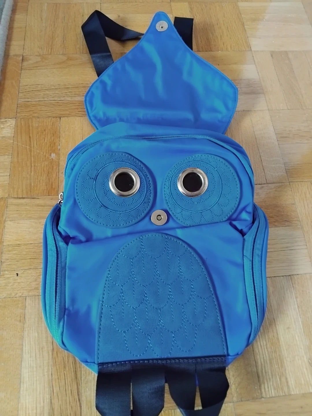 This fun blue backpack features an owl design with embroidered details and large metallic eyes. It has zippered side pockets and adjustable black straps. It's a unique accessory for kids or anyone who loves owls!