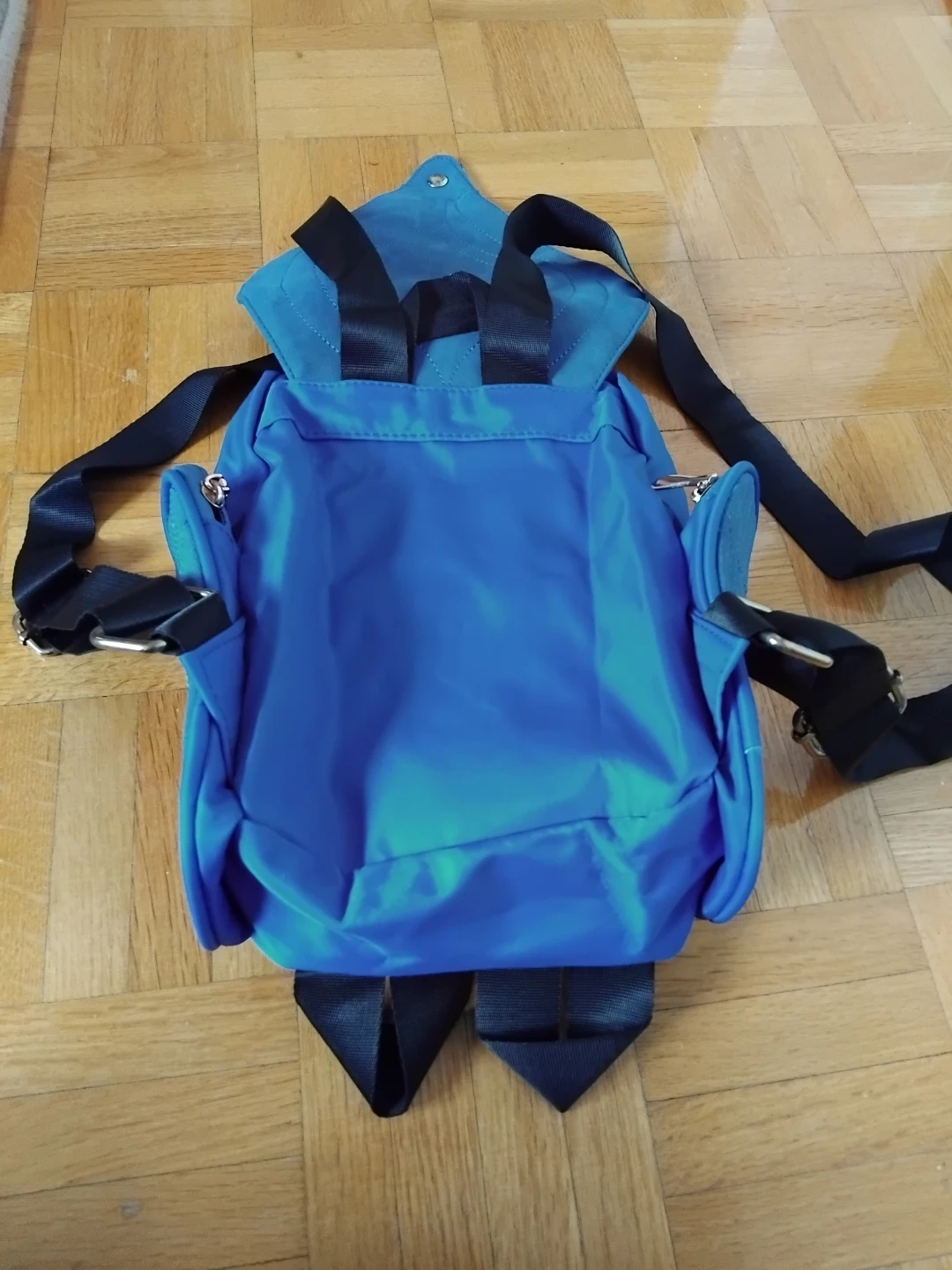 This fun blue backpack features an owl design with embroidered details and large metallic eyes. It has zippered side pockets and adjustable black straps. It's a unique accessory for kids or anyone who loves owls!