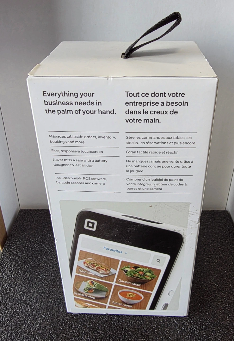 This is a Square Handheld point-of-sale system. It manages tableside orders, inventory, and bookings. It's designed with a fast, responsive touchscreen and a battery that lasts all day. Includes built-in POS software, barcode scanner, and camera.
