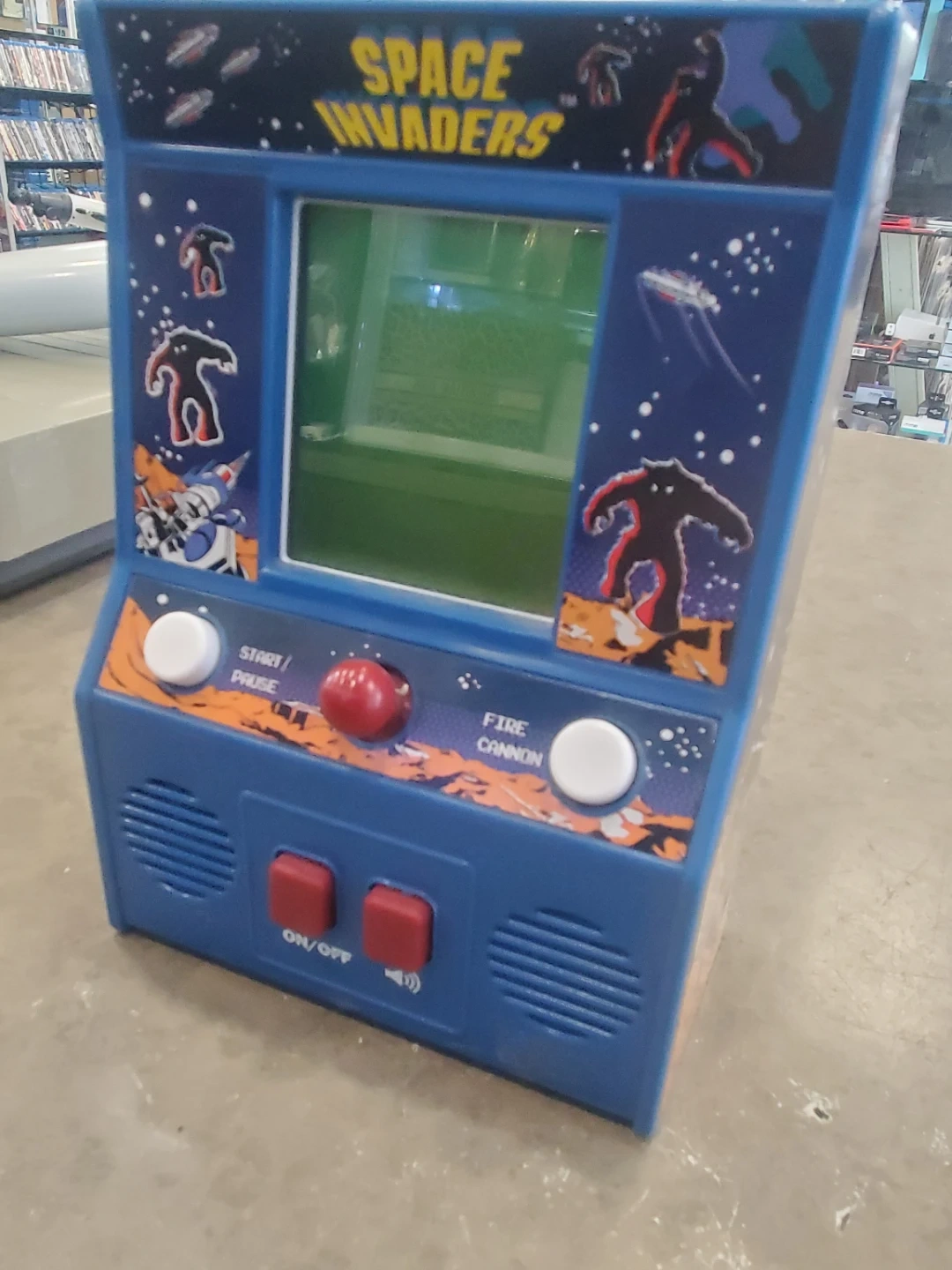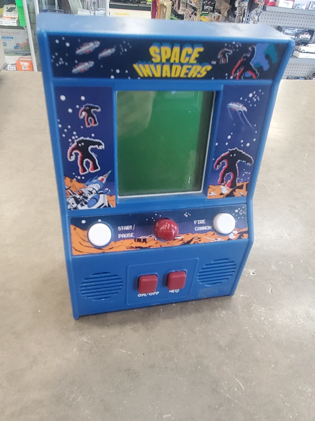 This is a handheld electronic game featuring the classic Space Invaders theme. It has buttons for on/off, start/pause, and fire cannon. A fun retro gaming experience is ready to go!