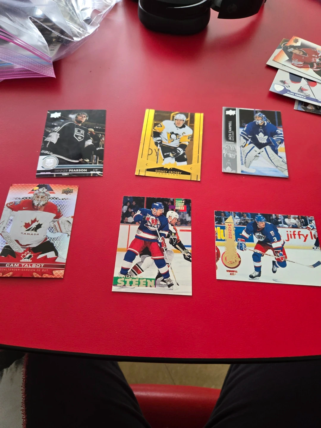Collection of hockey trading cards featuring NHL players. Includes Sidney Crosby, Jack Campbell of the Maple Leafs, Cam Talbot, and Tanner Pearson. These cards are a great addition for any hockey fan!