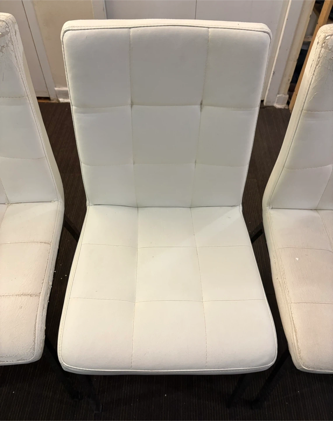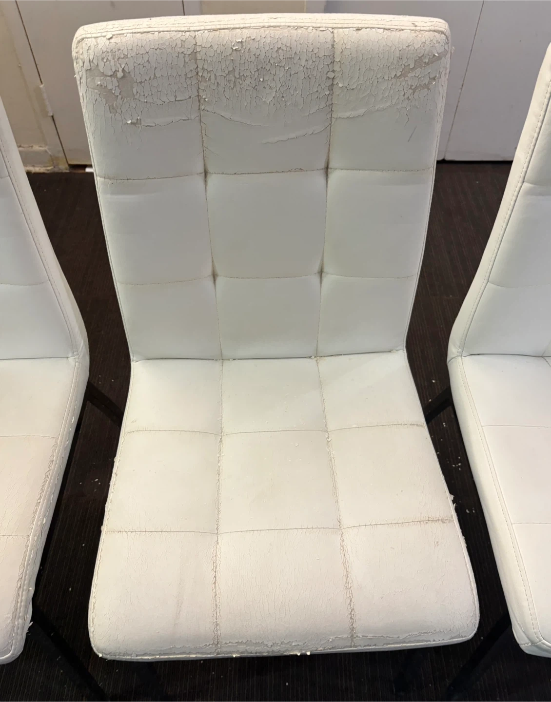 Selling a dining table set that includes a glass top table with chrome legs, and six chairs. The chairs have a black and white floral pattern cover on them, the actual chairs underneath are white leather but they are not in great condition (please refer to the pictures). The table is in great condition, the glass is perfect.