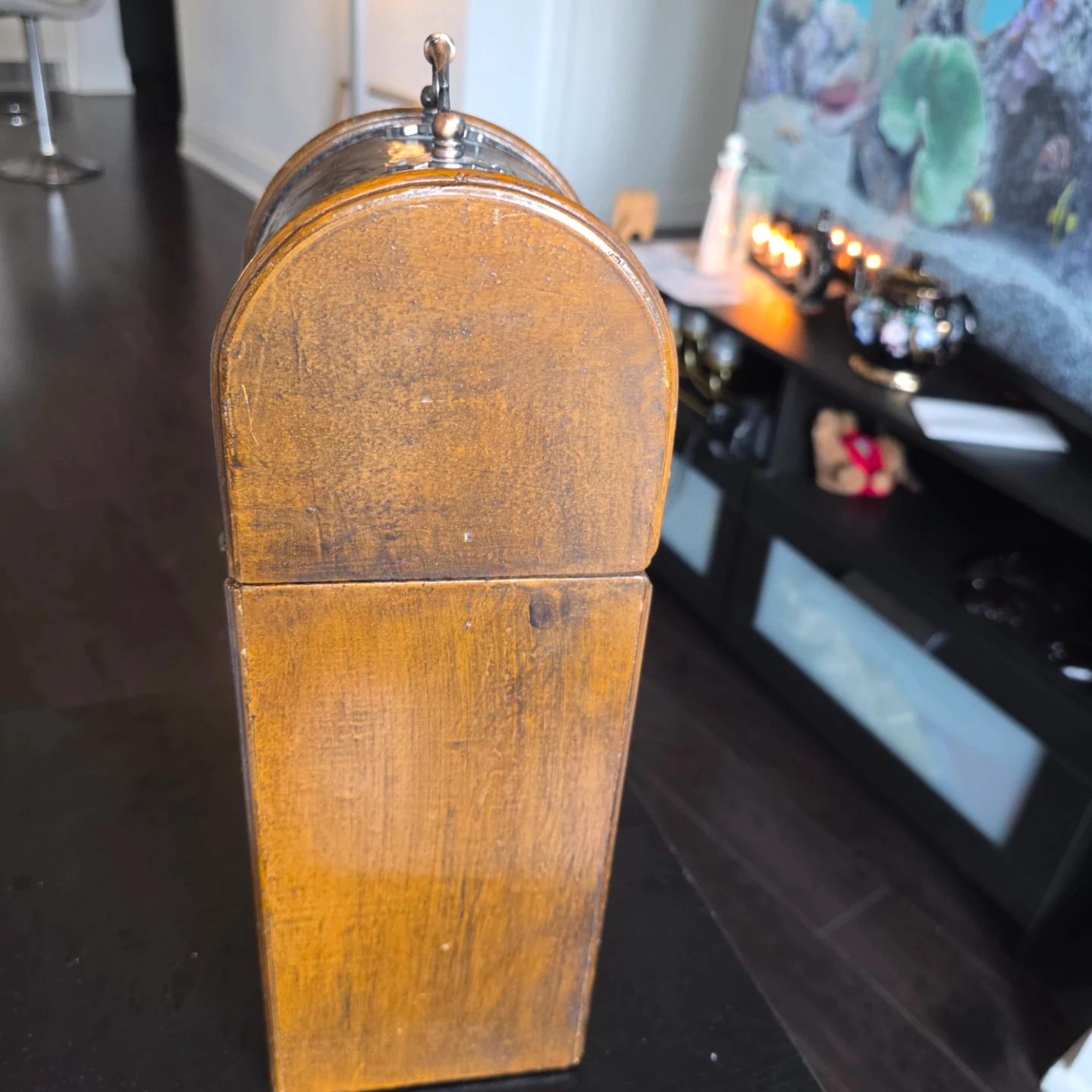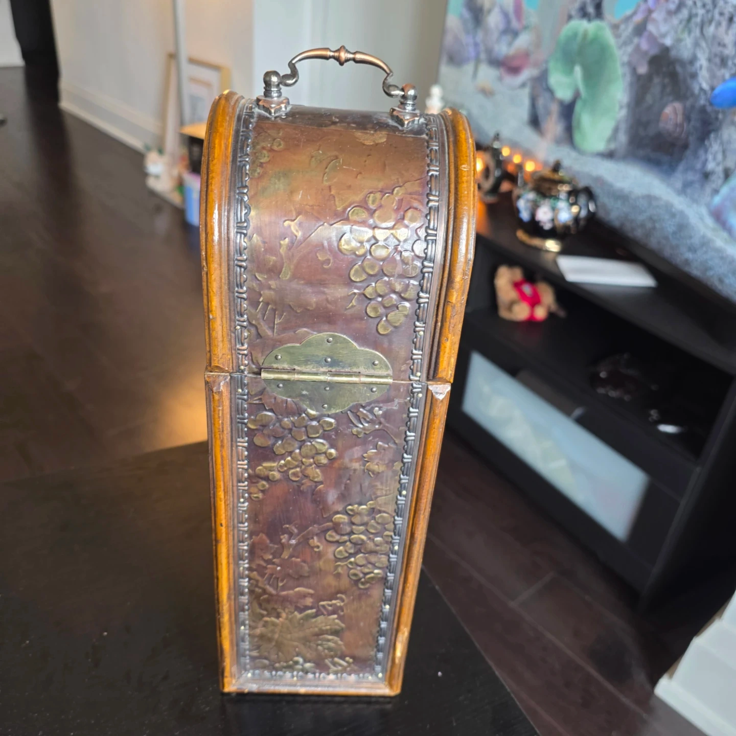 A lovely wooden holder designed for a single wine bottle. It features a decorative embossed grape vine design on all sides and a hinged lid with a latch closure. This holder's unique design makes it a charming display piece for your wine collection. It's perfect for gifting or adding a rustic touch to your home decor!