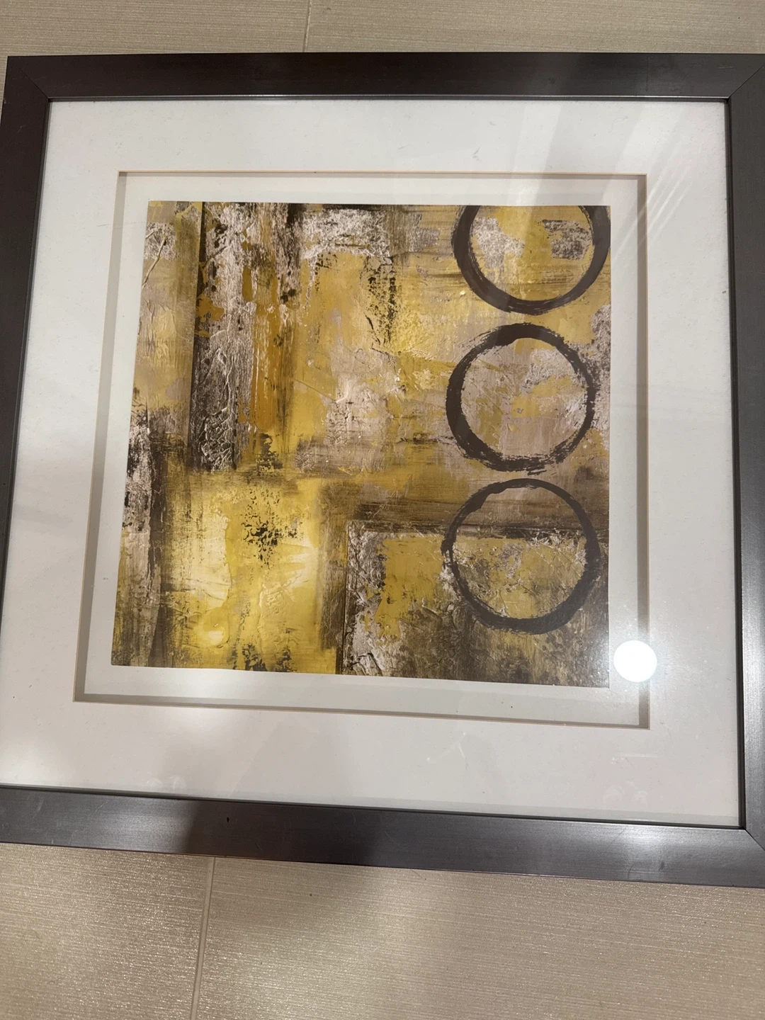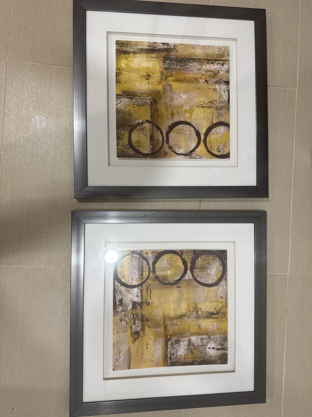 These framed prints feature an abstract design with yellow, brown, and grey tones. The artwork has a modern aesthetic with circular elements. Perfect for adding a touch of contemporary style to any room!