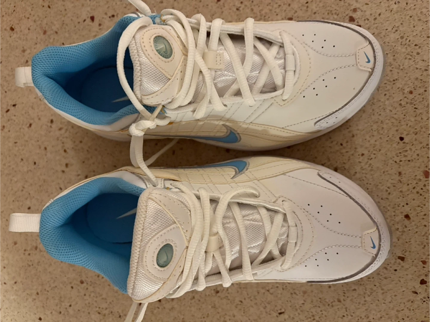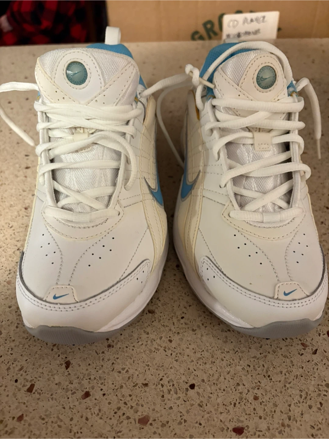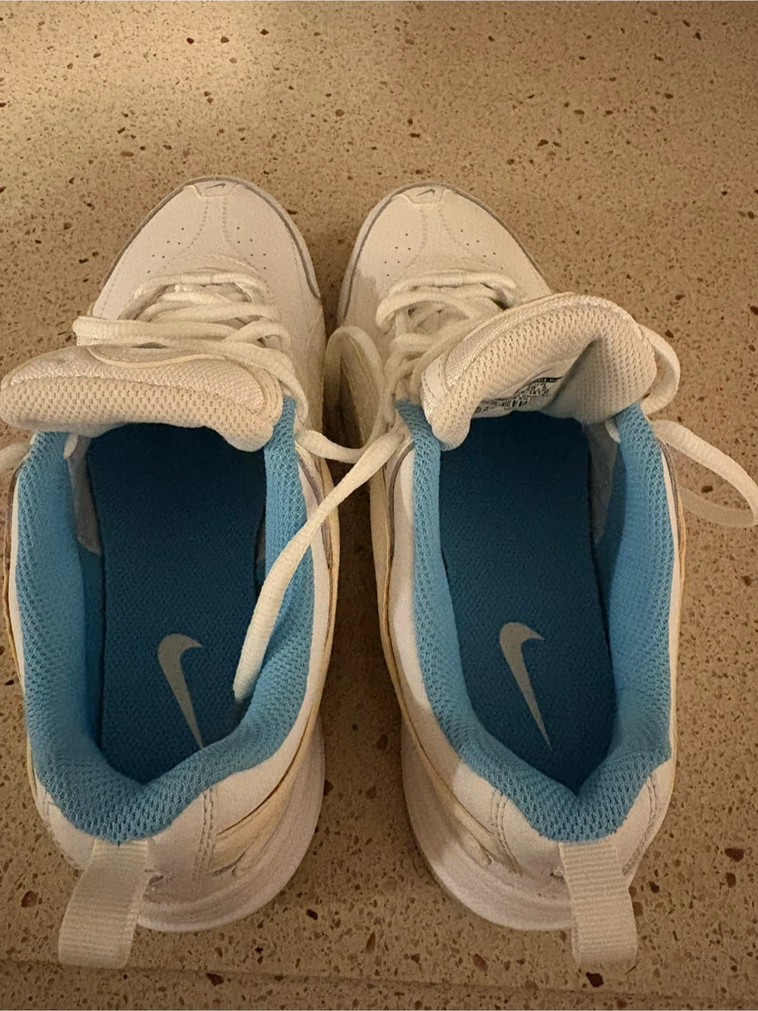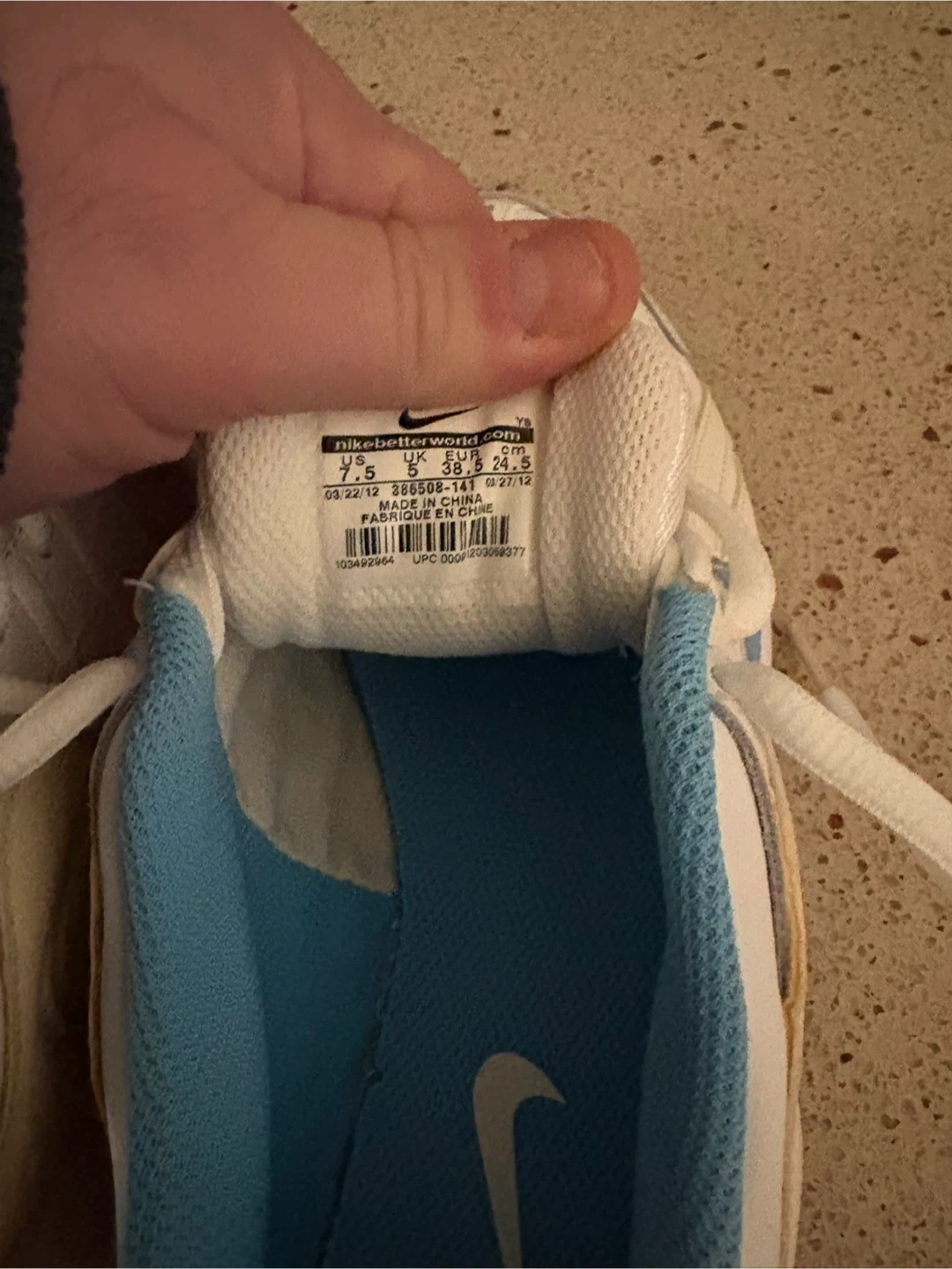 These are Nike women's running shoes in white with blue accents. They're a size 7.5 US / 5.5 UK / 38.5 EUR. Includes original box and packaging.