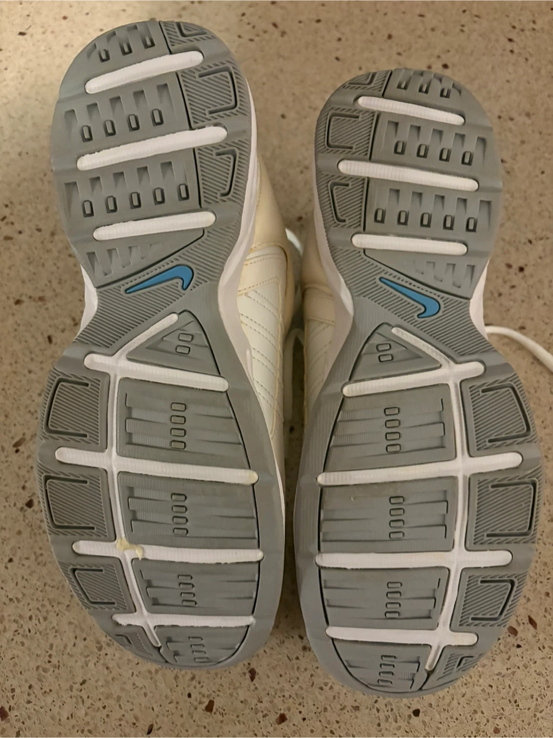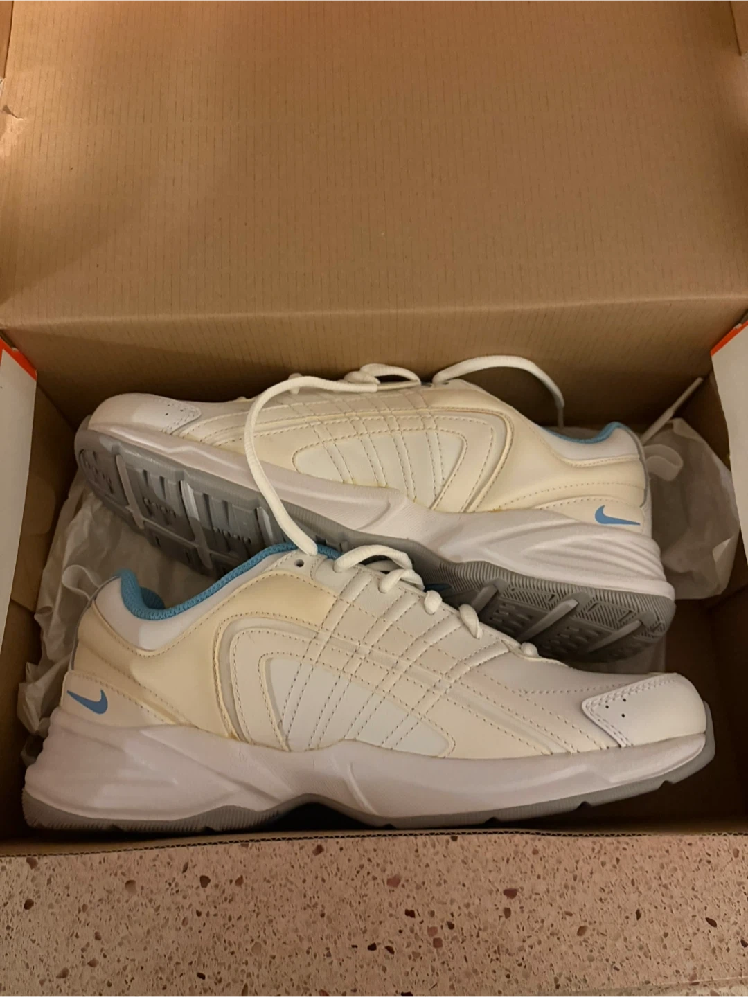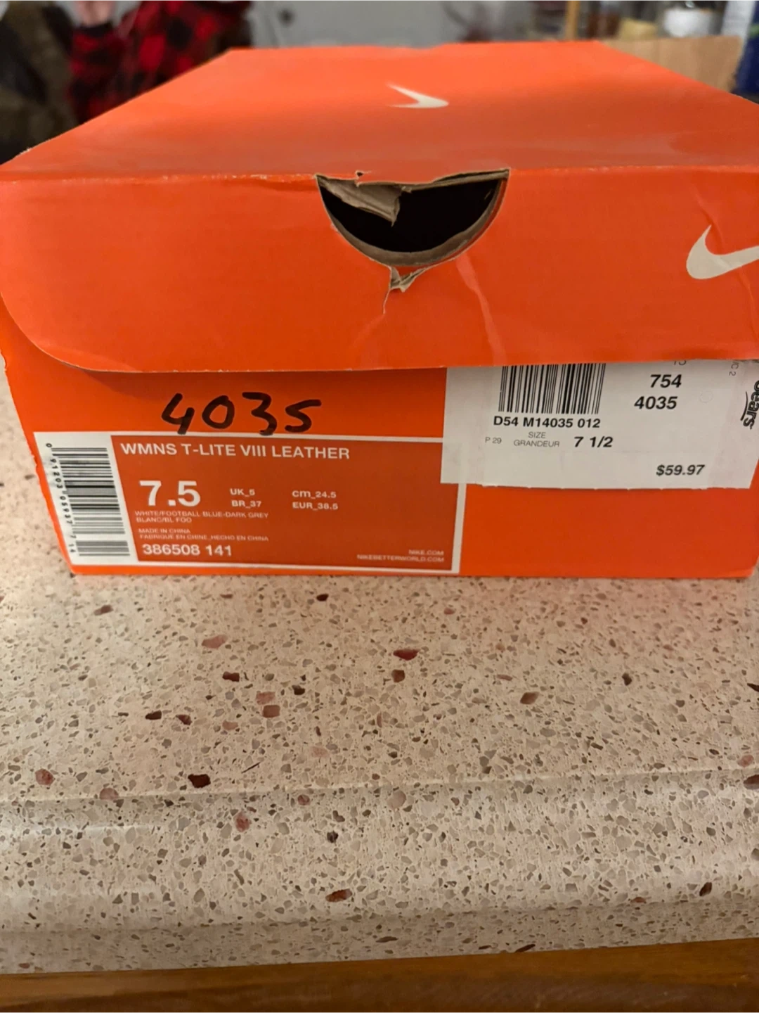 These are Nike women's running shoes in white with blue accents. They're a size 7.5 US / 5.5 UK / 38.5 EUR. Includes original box and packaging.