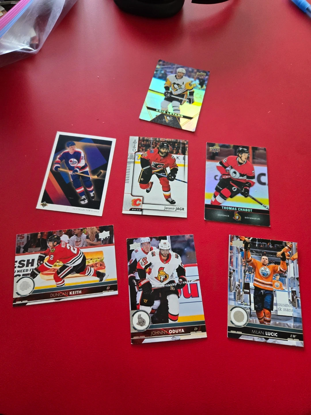 Collection of NHL hockey cards featuring players like Jaromir Jagr, Kris Letang, Duncan Keith, Thomas Chabot, Johnny Oduya, and Milan Lucic. These cards are great for any hockey fan's collection. They're collectible items for sports enthusiasts.