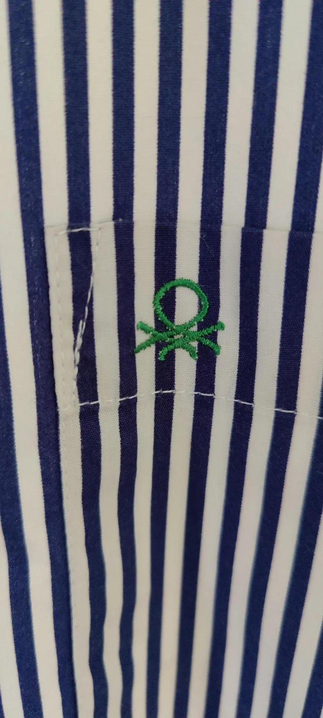 This is a United Colors of Benetton button-up shirt. It's a size 42. with a regular fit. The shirt features navy and white vertical stripes. I took my diet a lil too seriously and now this shirt won't fit me anymore.