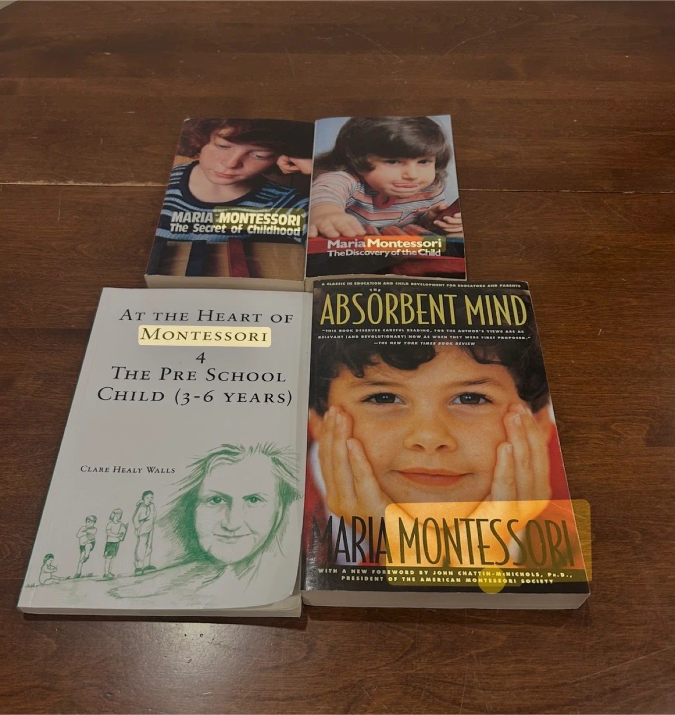 Four books on Maria Montessori's educational philosophy. Includes 'The Secret of Childhood', 'The Discovery of the Child', 'The Absorbent Mind', and 'At the Heart of Montessori: 4 The Pre School Child (3-6 Years)