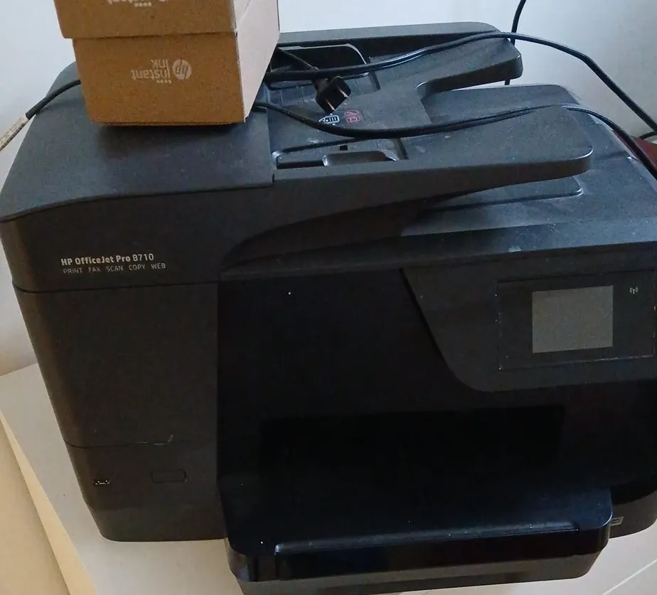This is an HP OfficeJet Pro 8710 all-in-one printer. It's capable of printing, faxing, scanning, and copying. As is, includes two set of original HP cartridge plus the one inside.