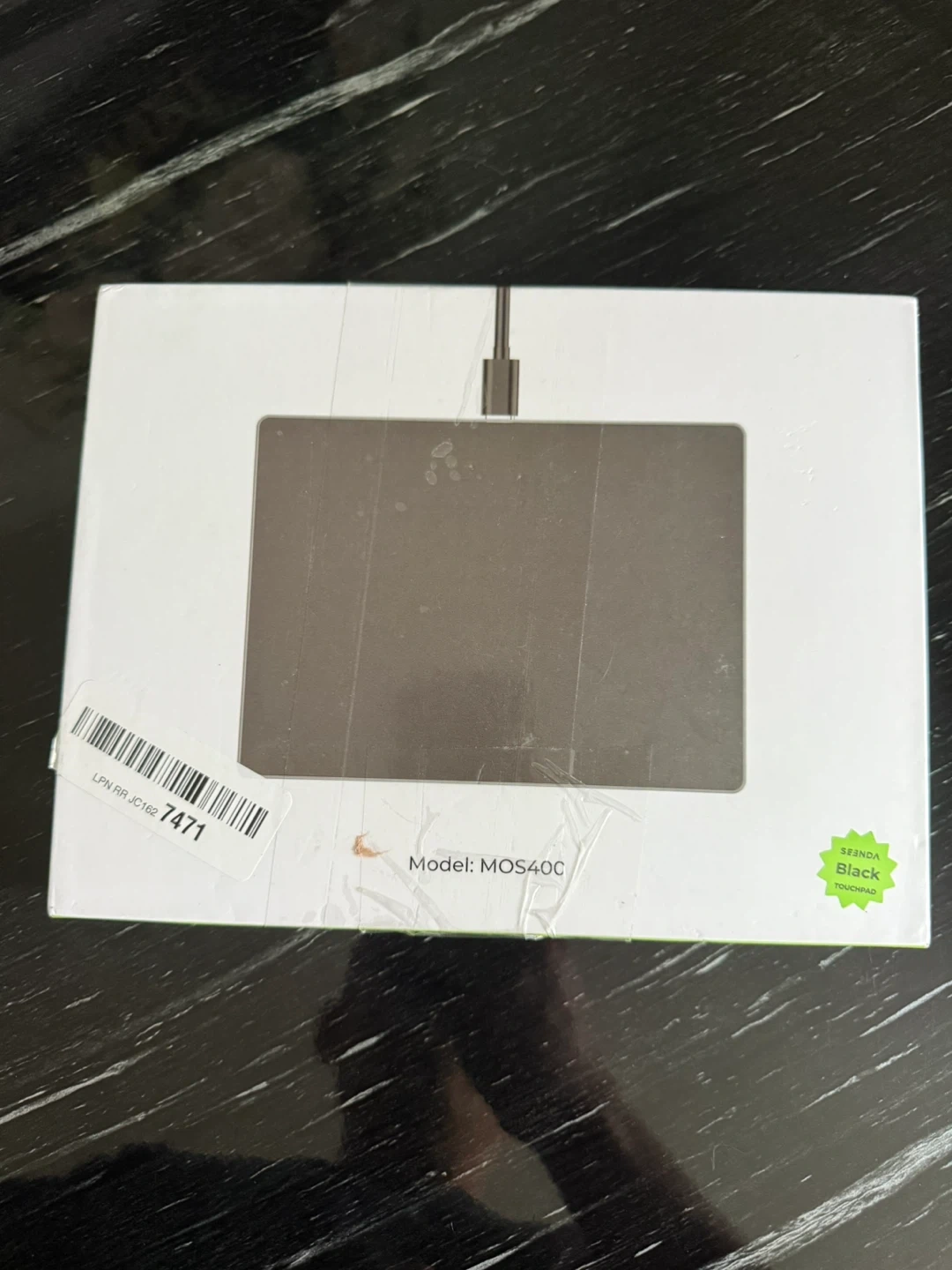 This SEENDA wired trackpad is model MOS400. It's made of aluminum and comes with a USB-C cable. A cleaning cloth is also included in the box.
