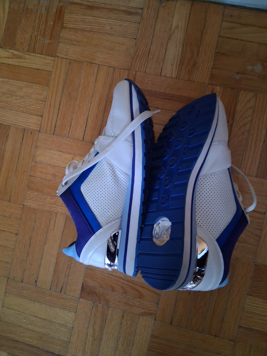 Michael Kors sneakers in white and blue leather. These kicks are super comfy and stylish! They feature perforated detailing and a sleek design.