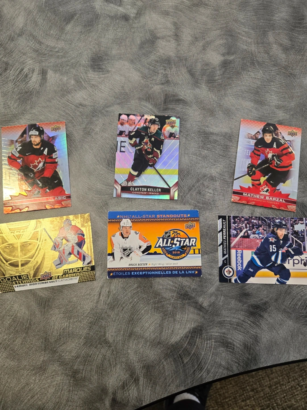 This lot includes 5 hockey trading cards featuring NHL players. Cards show Clayton Keller, Mathew Barzal, Mathieu Perreault, Samuel Montembeault, and Brock Boeser. Specific set details are visible on each card.