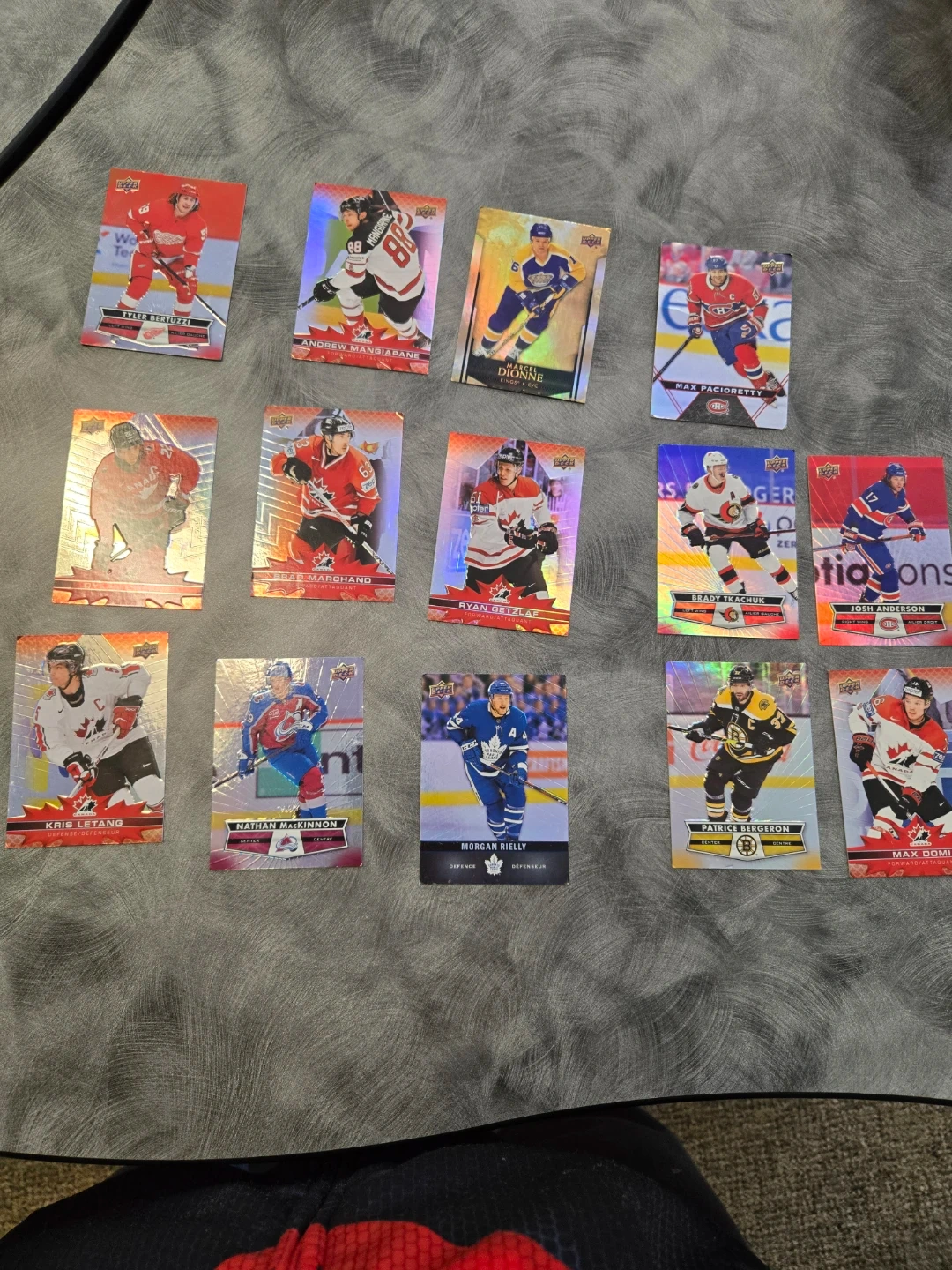 A collection of NHL hockey trading cards featuring various players. Includes players like Tyler Bertuzzi, Andrew Mangiapane, Marcel Dionne, Max Pacioretty, Brad Marchand, Ryan Getzlaf, Kris Letang, Nathan MacKinnon, Morgan Rielly, Brady Tkachuk, Patrice Bergeron, and Josh Anderson. These cards are great for any hockey fan's collection!