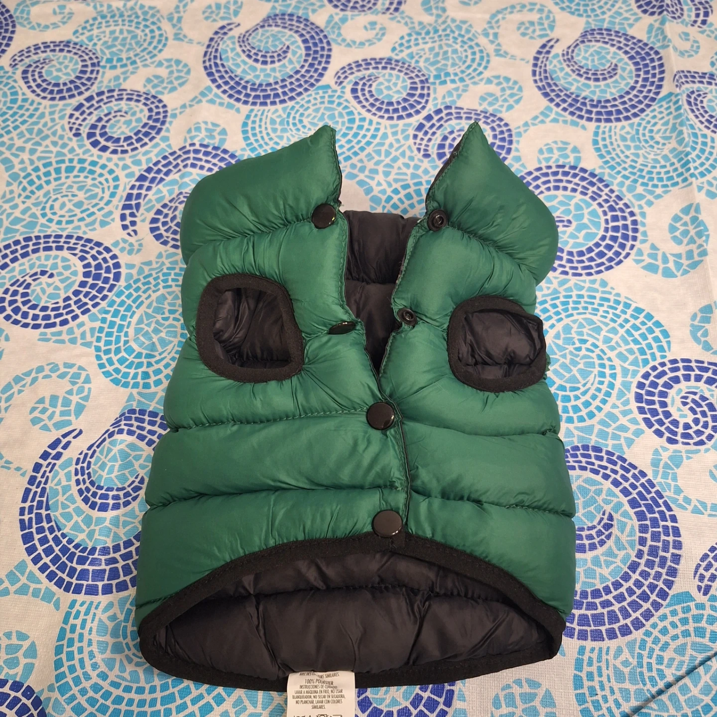 Quilted green puffer dog vest. Made of 100% polyester. Features snap closures and armholes for easy movement. Keep your furry friend cozy and stylish!