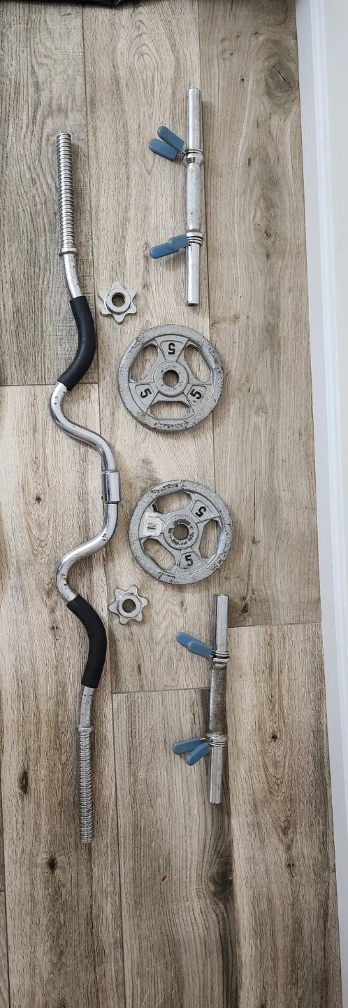 This set includes A Super Curl Bar & a curl barbell and two 5lb weight plates. The barbell features rubber grips for comfort. It's great for various arm exercises!