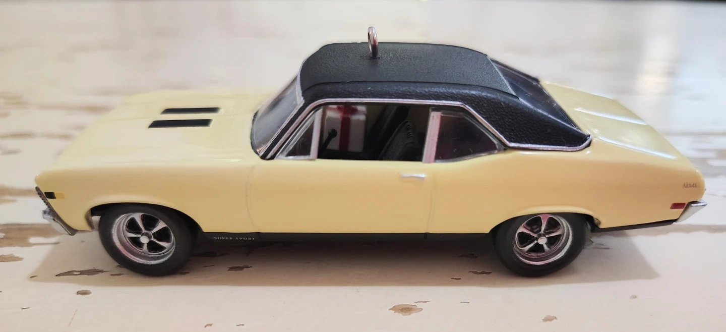This is a 2018 Chevrolet Nova Super Sport 1968 collectible ornament. It's a die-cast metal model with a black roof and interior. Features a small gift detail inside the car.