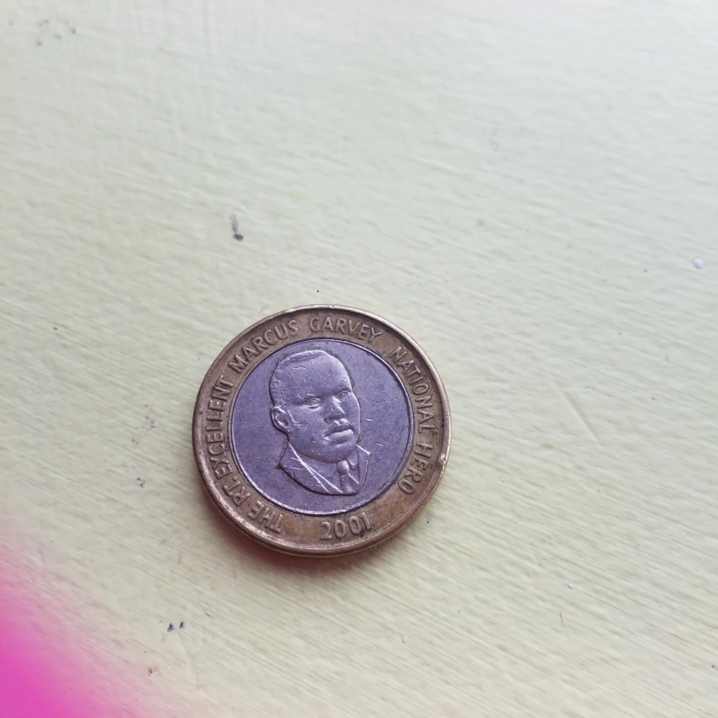 This is a 20 Jamaican Dollars coin featuring Marcus Garvey. The coin's reverse side displays the Jamaican coat of arms, and the obverse side features a portrait of Marcus Garvey, 'The Right Excellent National Hero'. It was minted in 2001. This coin is a great addition for collectors.