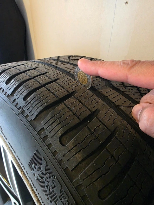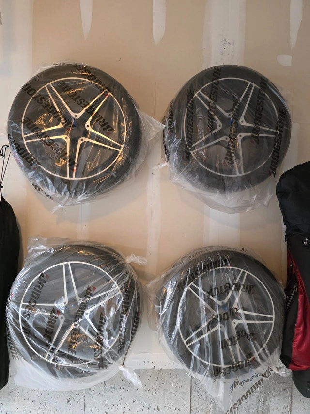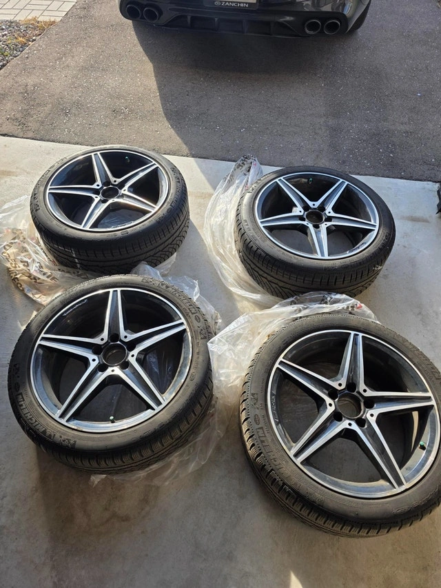 Selling a set of winter wheels that came off a 2021 Mercedes-Benz C43 AMG. They were used for two seasons (purchased Winter 2023) and are in good condition. One rim has minor curb rash, but otherwise, they are in great shape. These are OEM MB Rims and should fit most C-Class models (C300, C400, C450, C43), but please verify fitment for your specific vehicle. The wheels are staggered for the C43's front brakes and have been marked accordingly. Includes Tire Pressure Monitoring System (TPMS) and center caps.