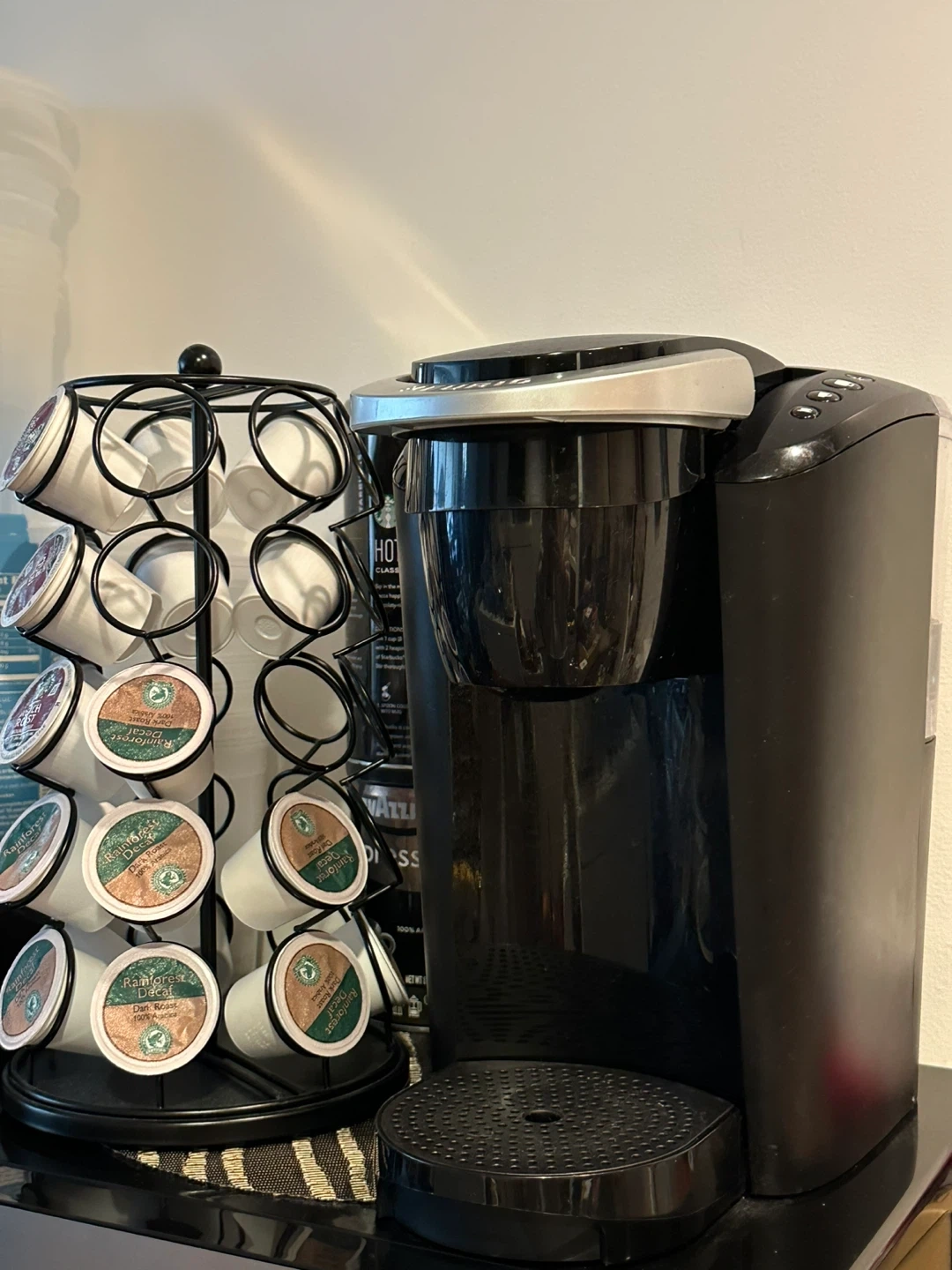 This is a Keurig K-Cup coffee maker. It's black with a silver accent around the top. The drip tray is removable. It's simple to use for quick single servings of coffee. A capsule coffee stand is included as well. Very good condition and clean.