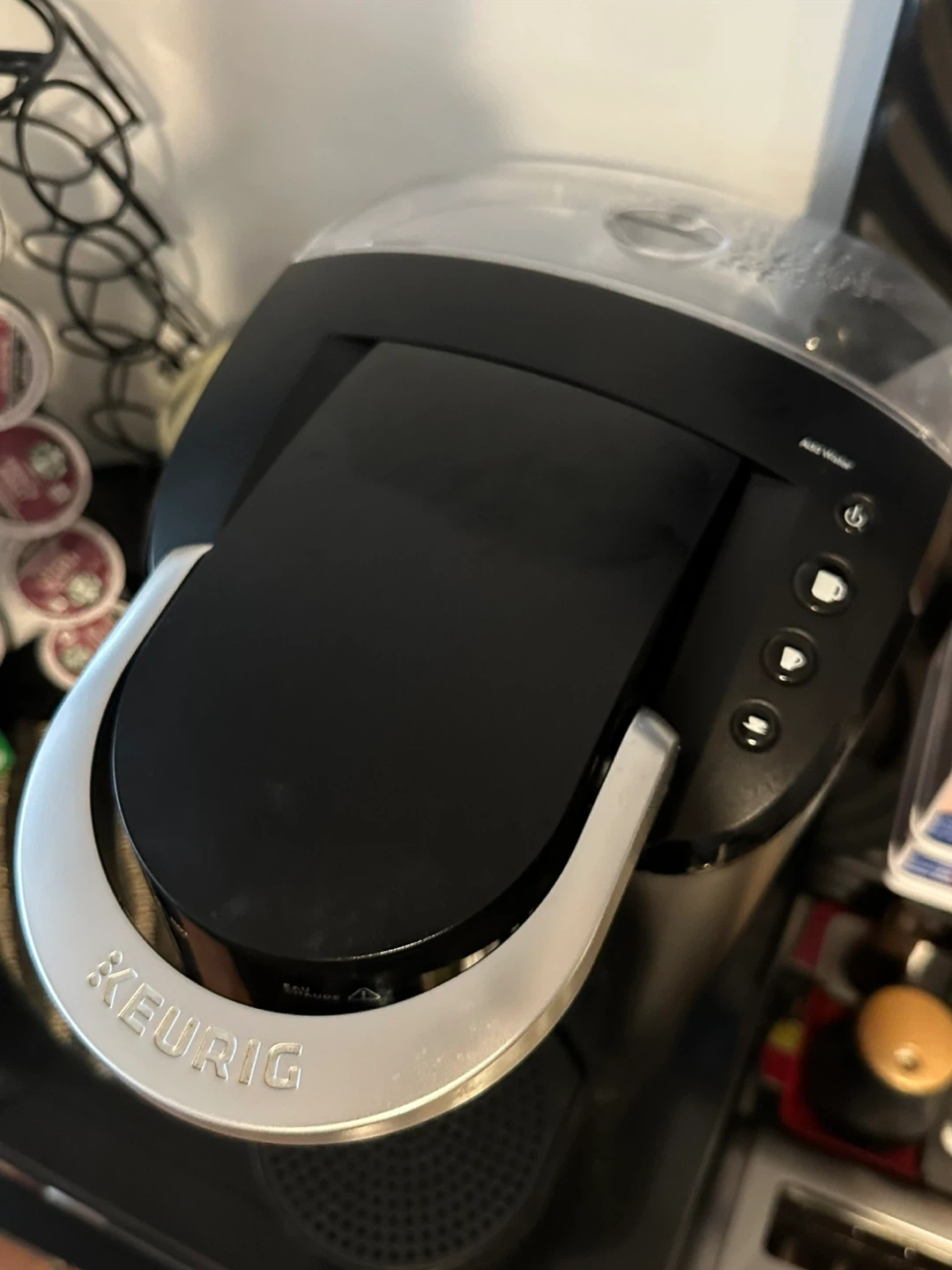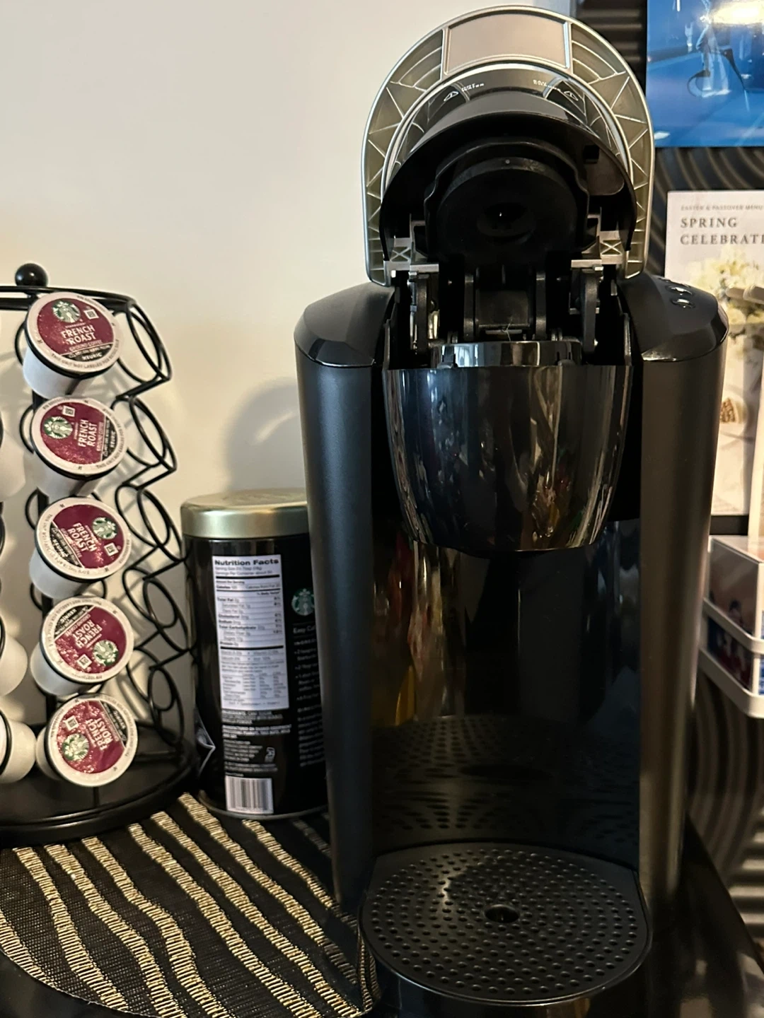 This is a Keurig K-Cup coffee maker. It's black with a silver accent around the top. The drip tray is removable. It's simple to use for quick single servings of coffee. A capsule coffee stand is included as well. Very good condition and clean.
