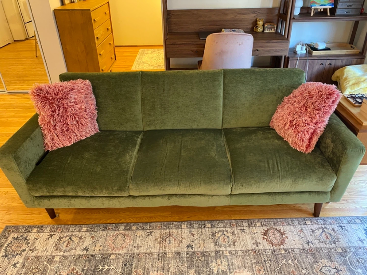 A stylish green velvet sofa with three seat cushions. It has a plush, soft texture. This sofa comfortably seats three people and would be a lovely addition to any living space!