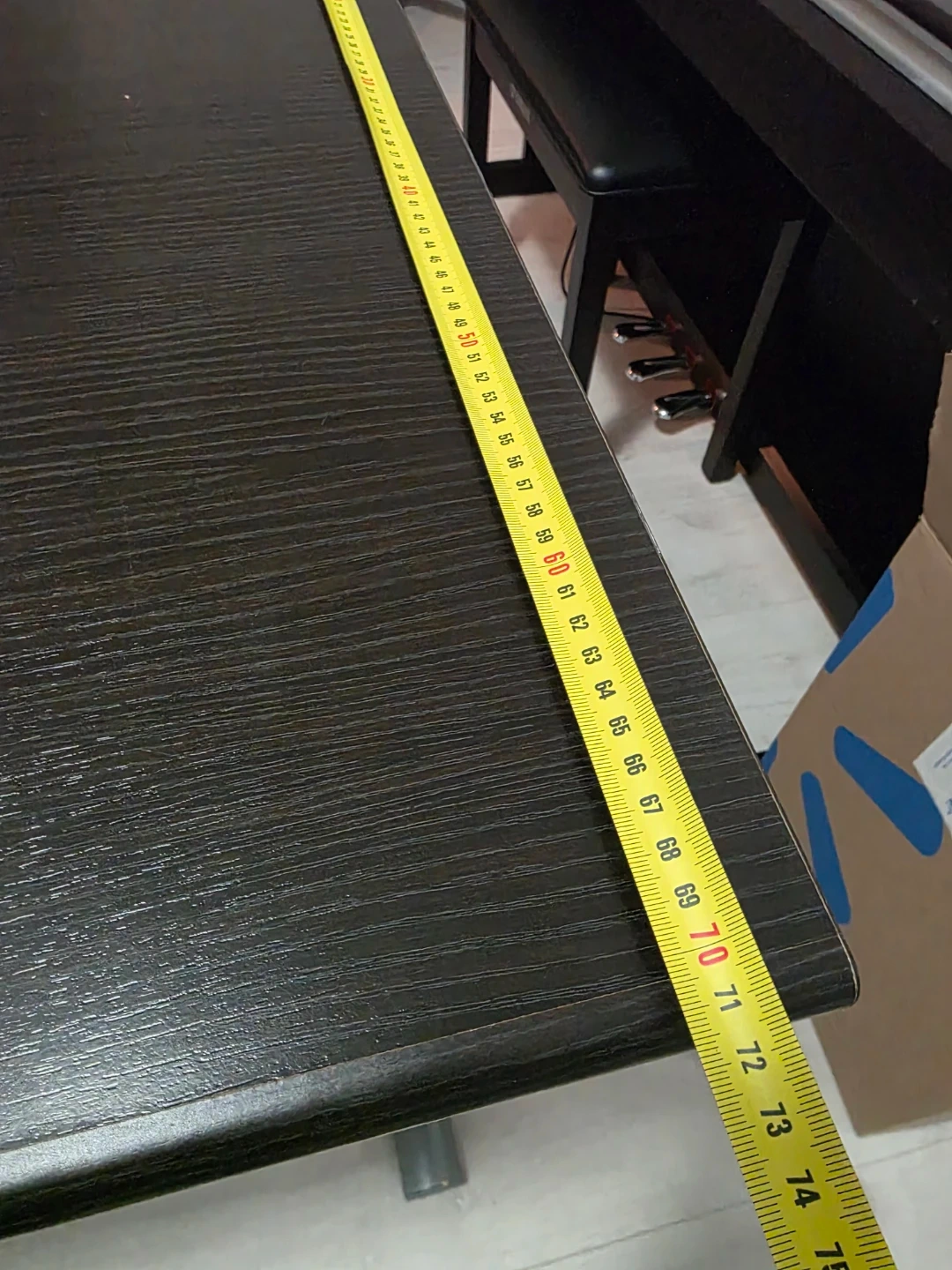 This desk has a dark wood laminate top and a grey metal frame. It features one pull-out drawer for storage.
