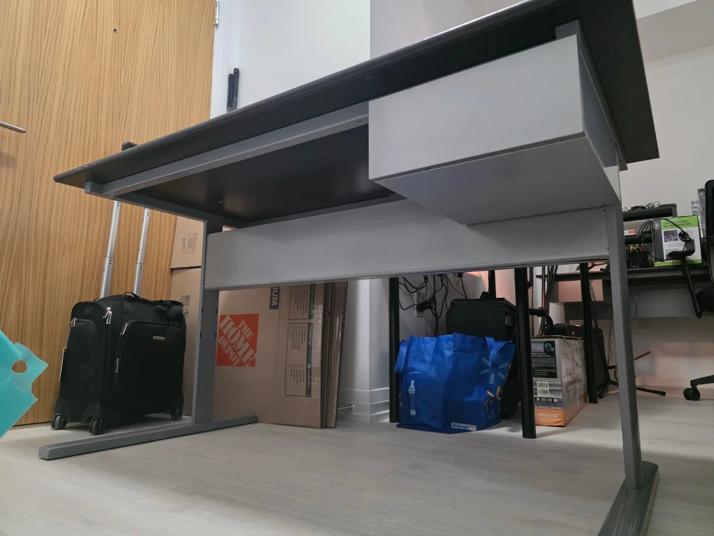 This desk has a dark wood laminate top and a grey metal frame. It features one pull-out drawer for storage.