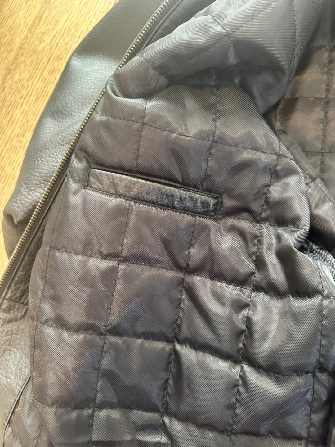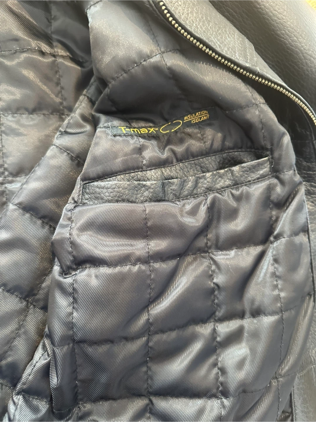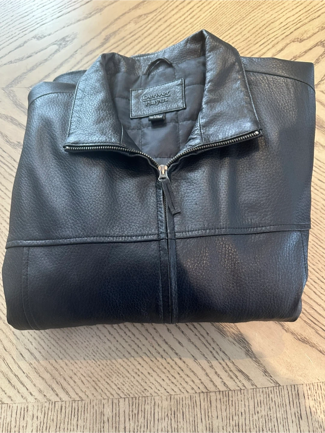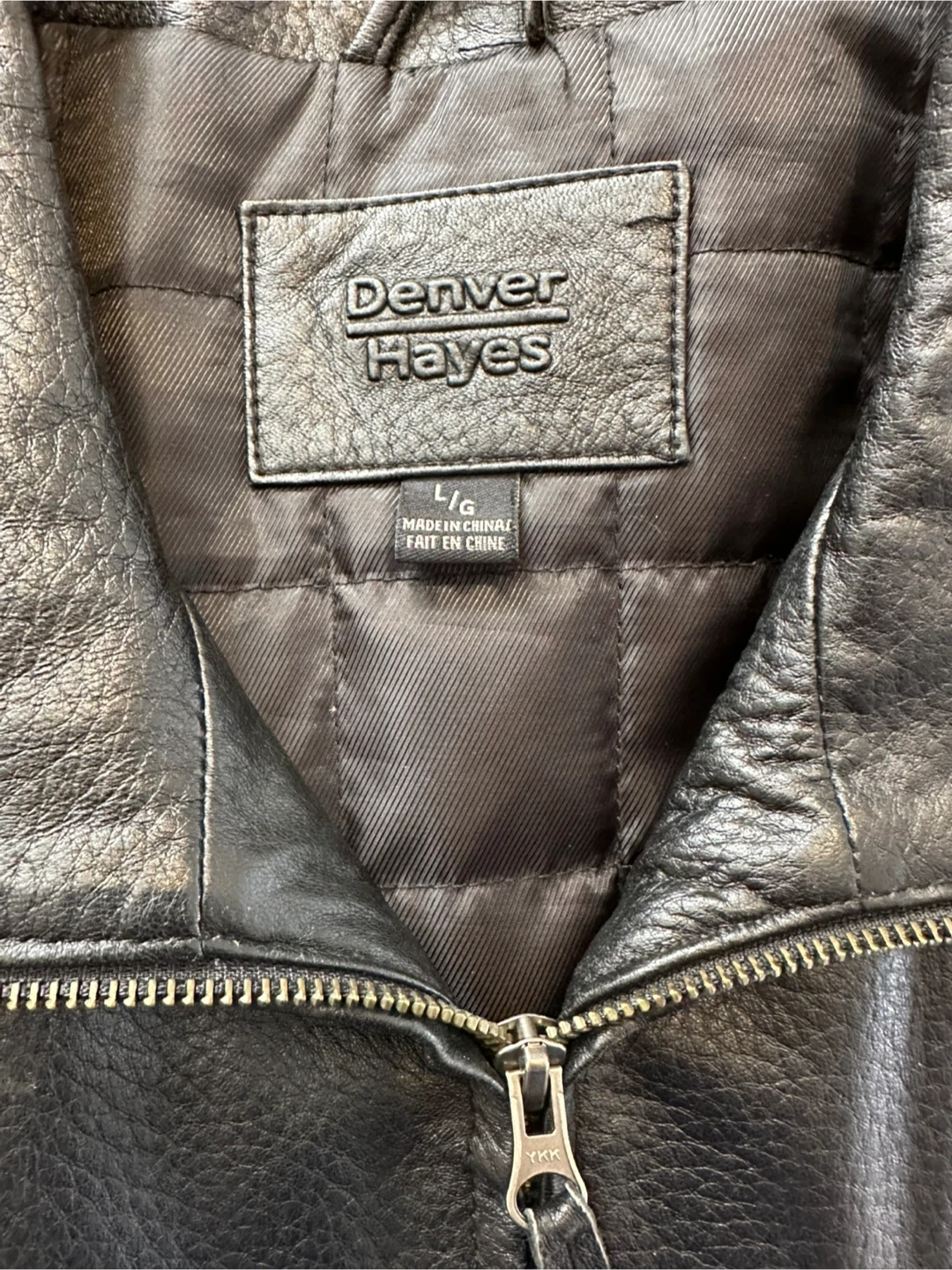 Denver Hayes black faux leather jacket with a quilted lining. It features a zip-up front and two front pockets. This jacket is insulated for added warmth. Also has 2 inside pockets for phone/wallet. Excellent condition and only work a few times.