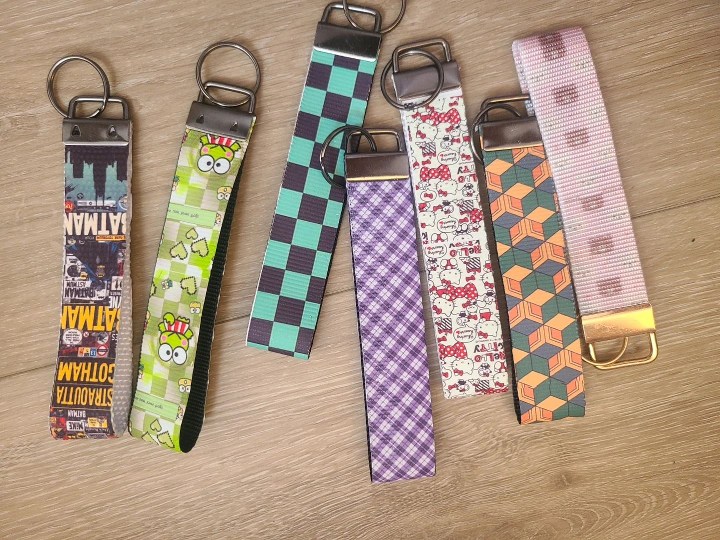 A collection of fabric wristlet keychains featuring various popular character designs. Includes Batman, Keroppi, Hello Kitty, and geometric patterns. They're made with durable fabric and metal hardware. These are great for attaching to bags or keys!