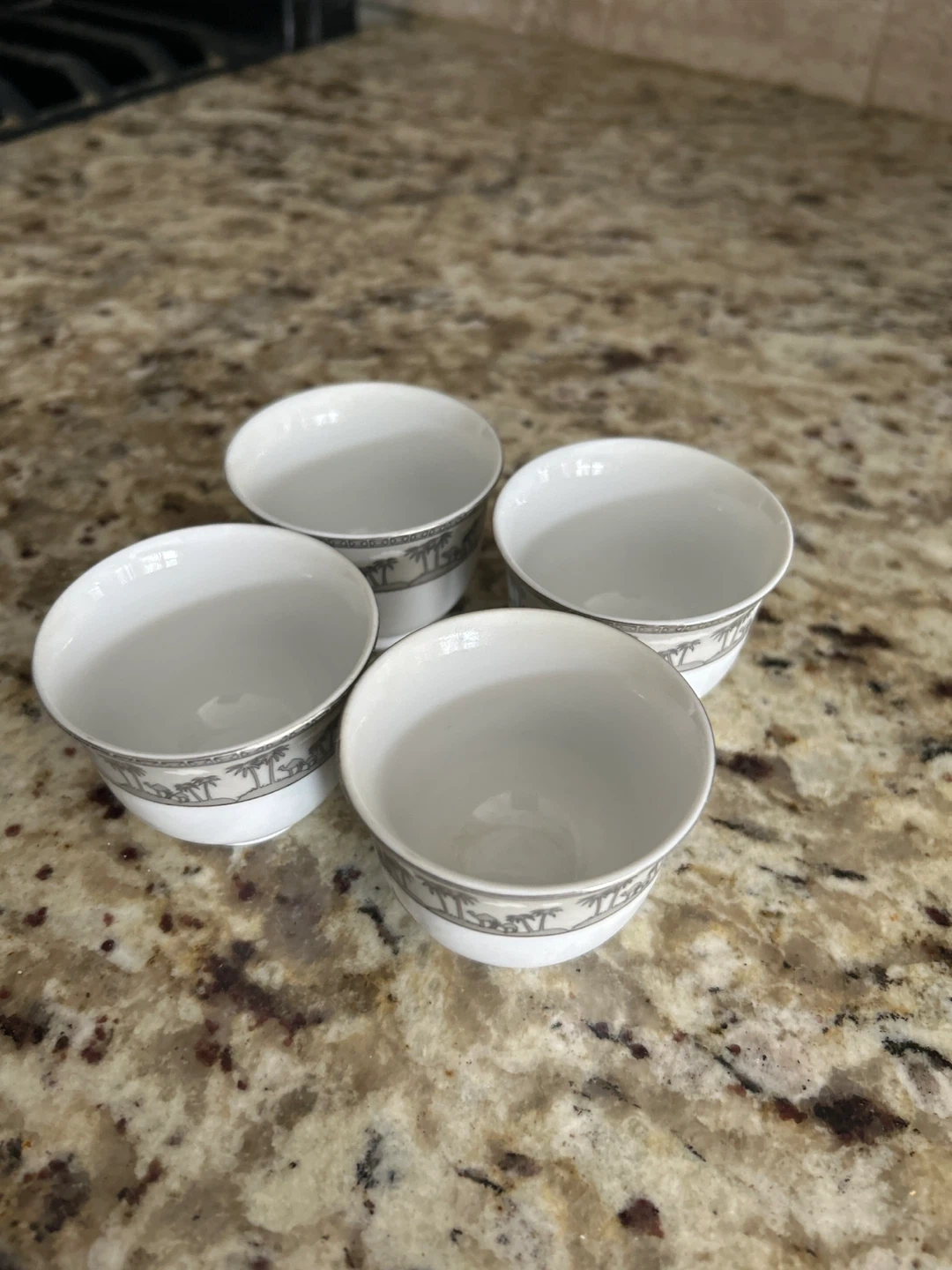 A set of four white coffee cups featuring a decorative grey palm tree and band design around the rim. These small cups are suitable for espresso or traditional coffee service. They're made of ceramic. These have been bought in Japan