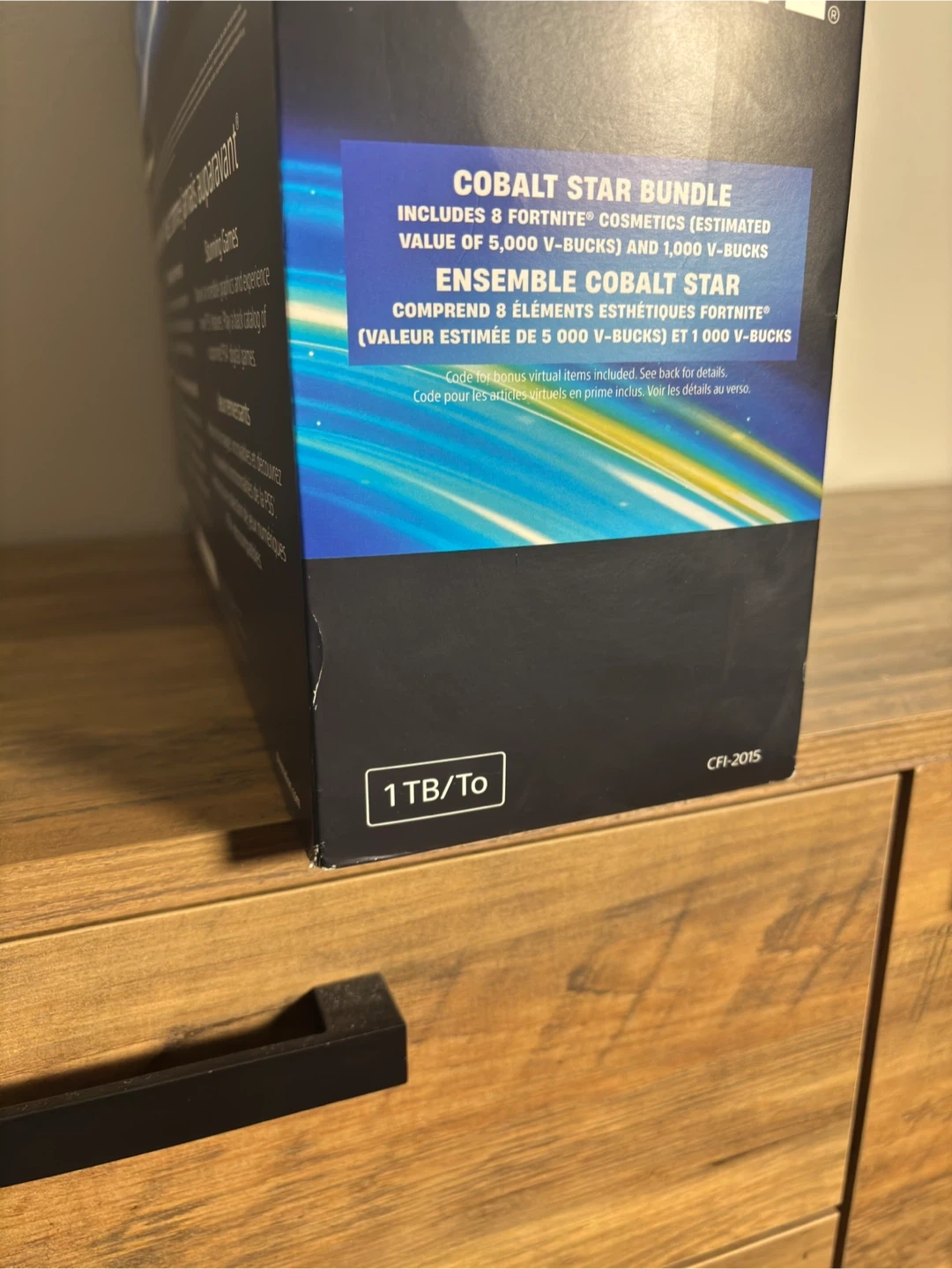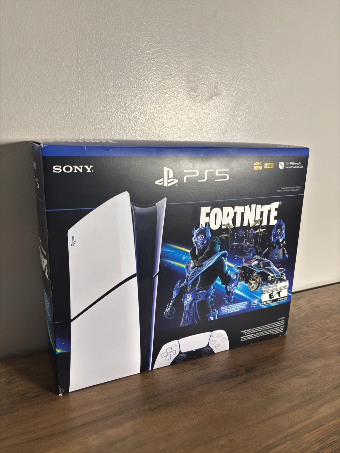 A PS5 Digital Slim 1TB in excellent condition — special Fortnite Cobalt Star Edition, complete with every original item.