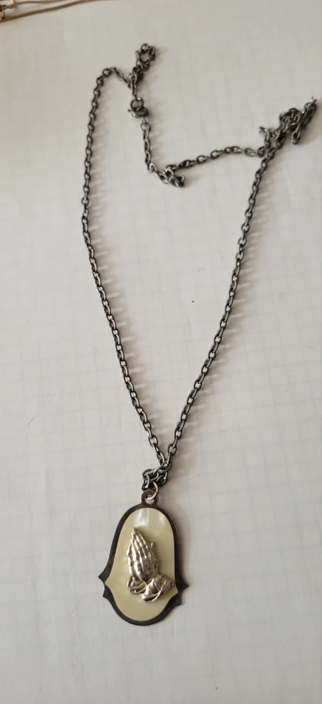 This necklace features a pendant with the Serenity Prayer engraved on one side. It also has a smaller charm with praying hands. The chain is metal. It's a thoughtful piece for anyone seeking comfort and guidance.