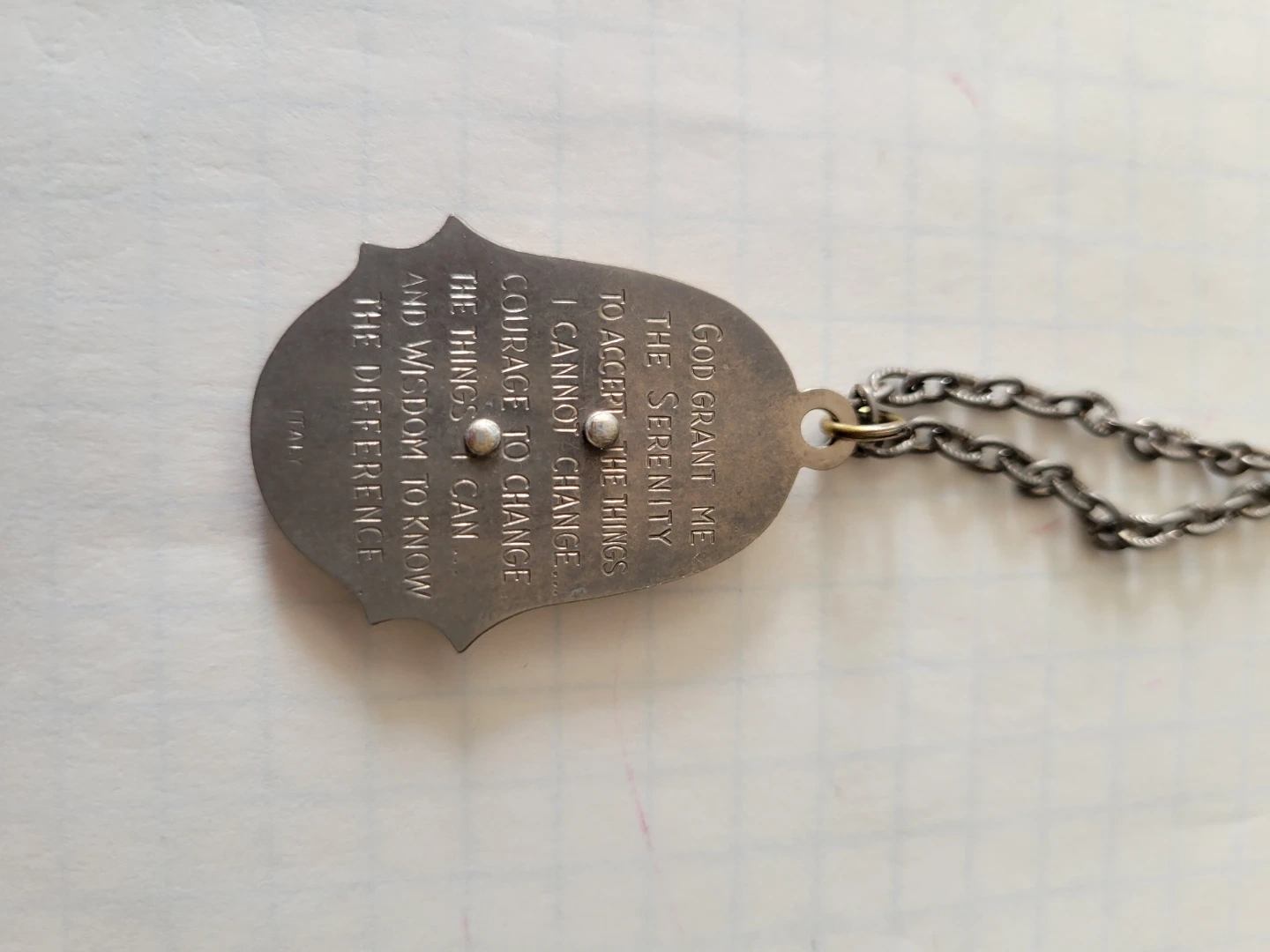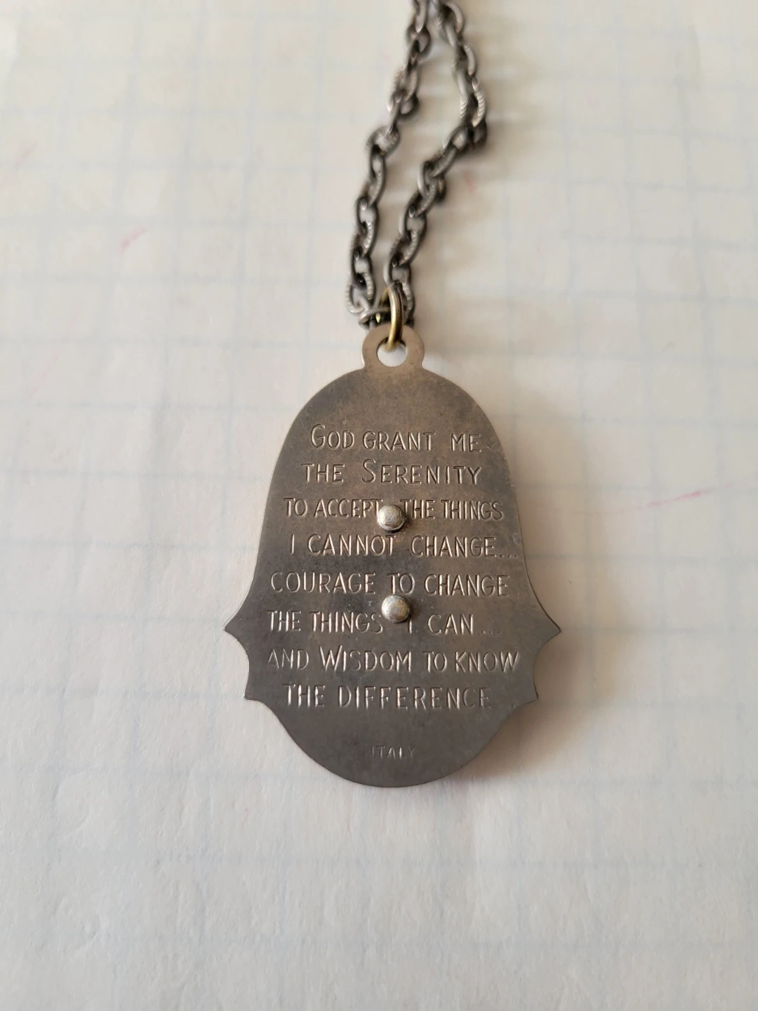 This necklace features a pendant with the Serenity Prayer engraved on one side. It also has a smaller charm with praying hands. The chain is metal. It's a thoughtful piece for anyone seeking comfort and guidance.
