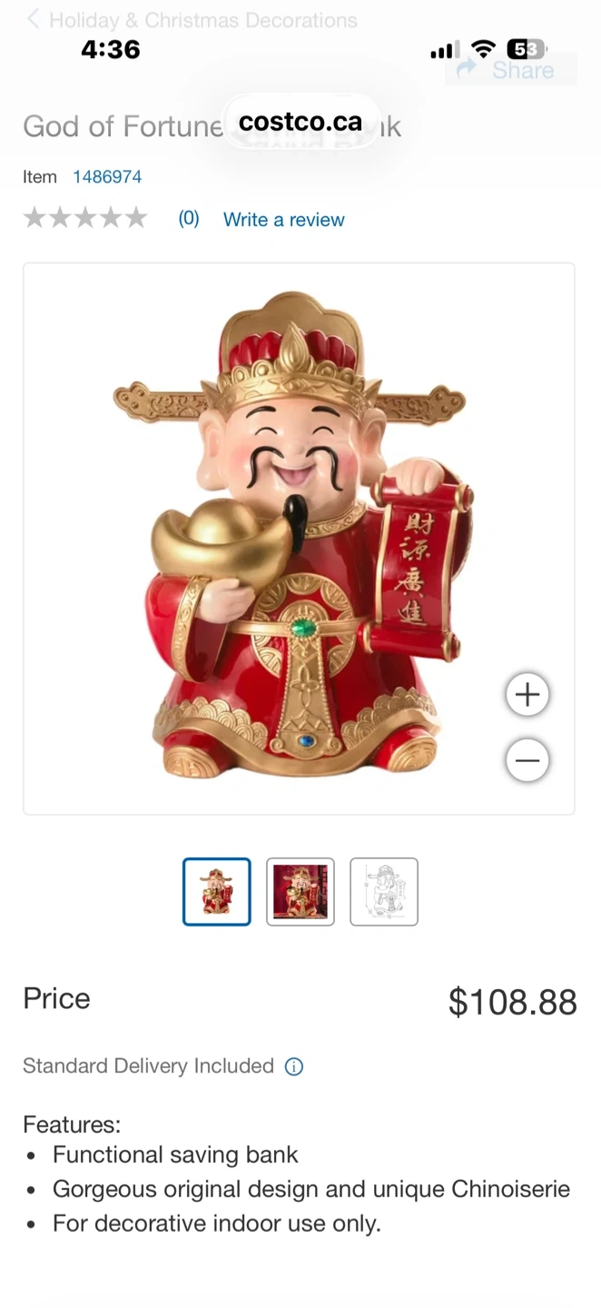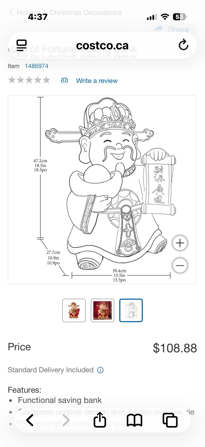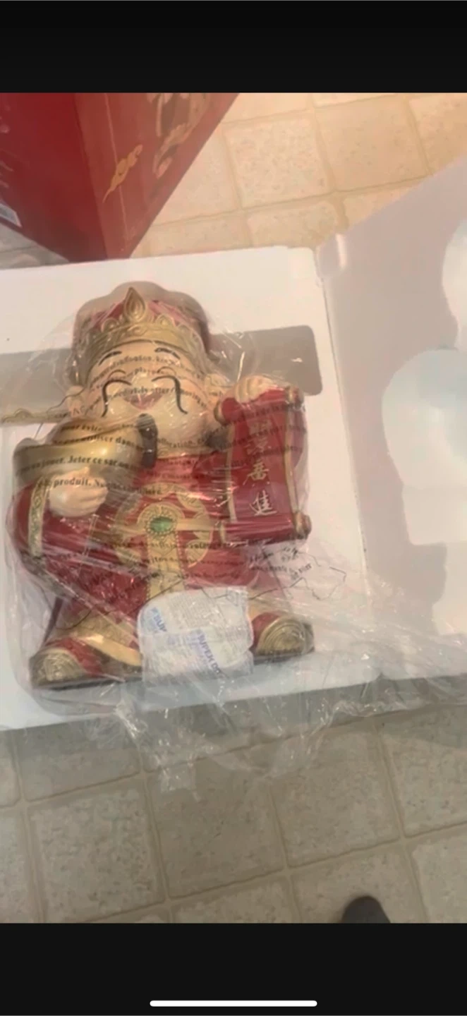 This is a God of Fortune saving bank, also known as a coin bank. It's made of resin and is red and gold in colour. The item's dimensions are 47.3cm H x 22.7cm W x 10.9cm D.