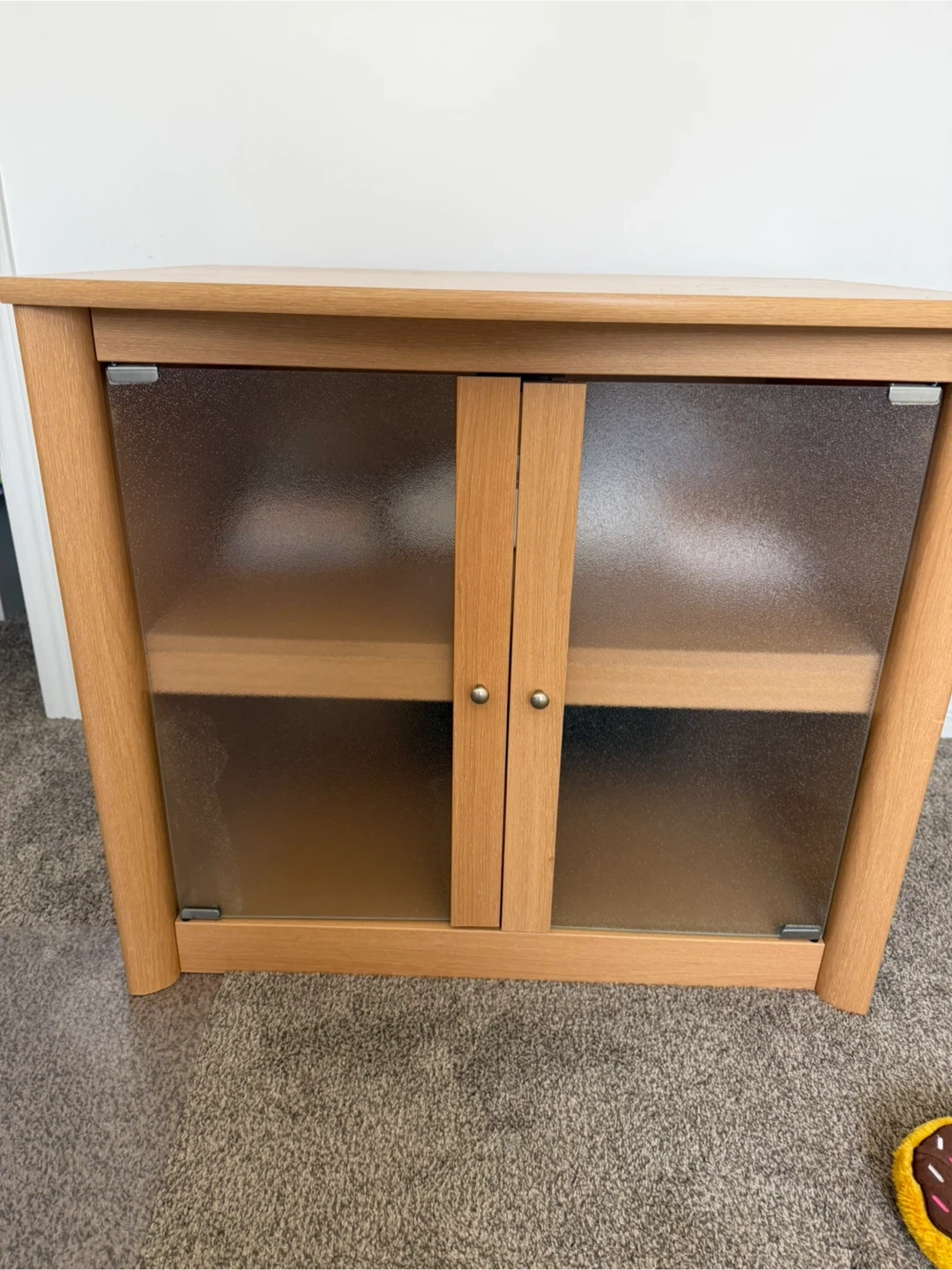 A lovely wooden cabinet featuring two frosted glass doors with small brass knobs. It's got two shelves inside for storage. This piece could be used to display items or for general storage in a living room or den.