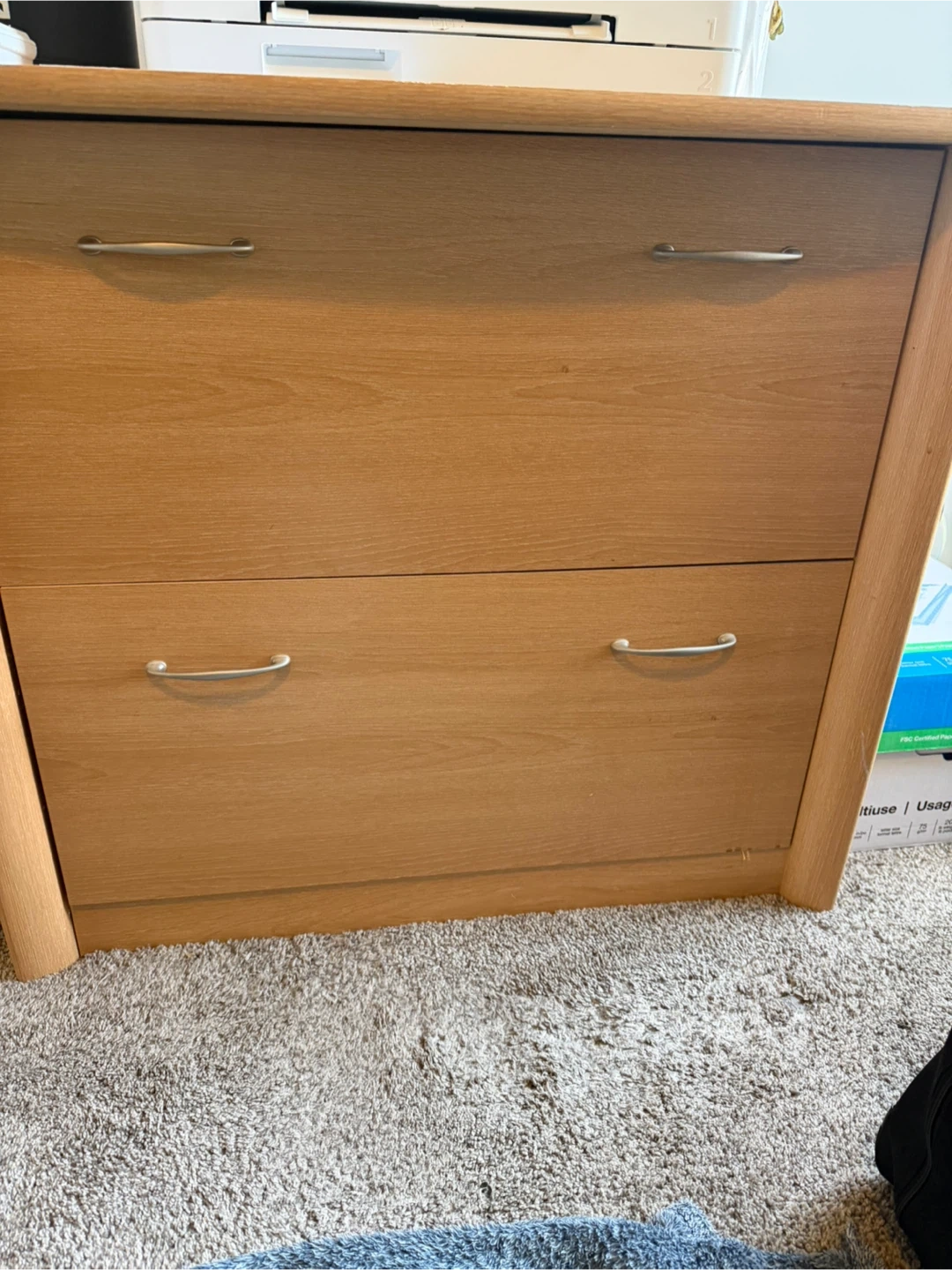 A two-drawer filing cabinet made of wood with silver handles. It's ideal for organizing documents at home or in an office. Its simple design fits most decors.