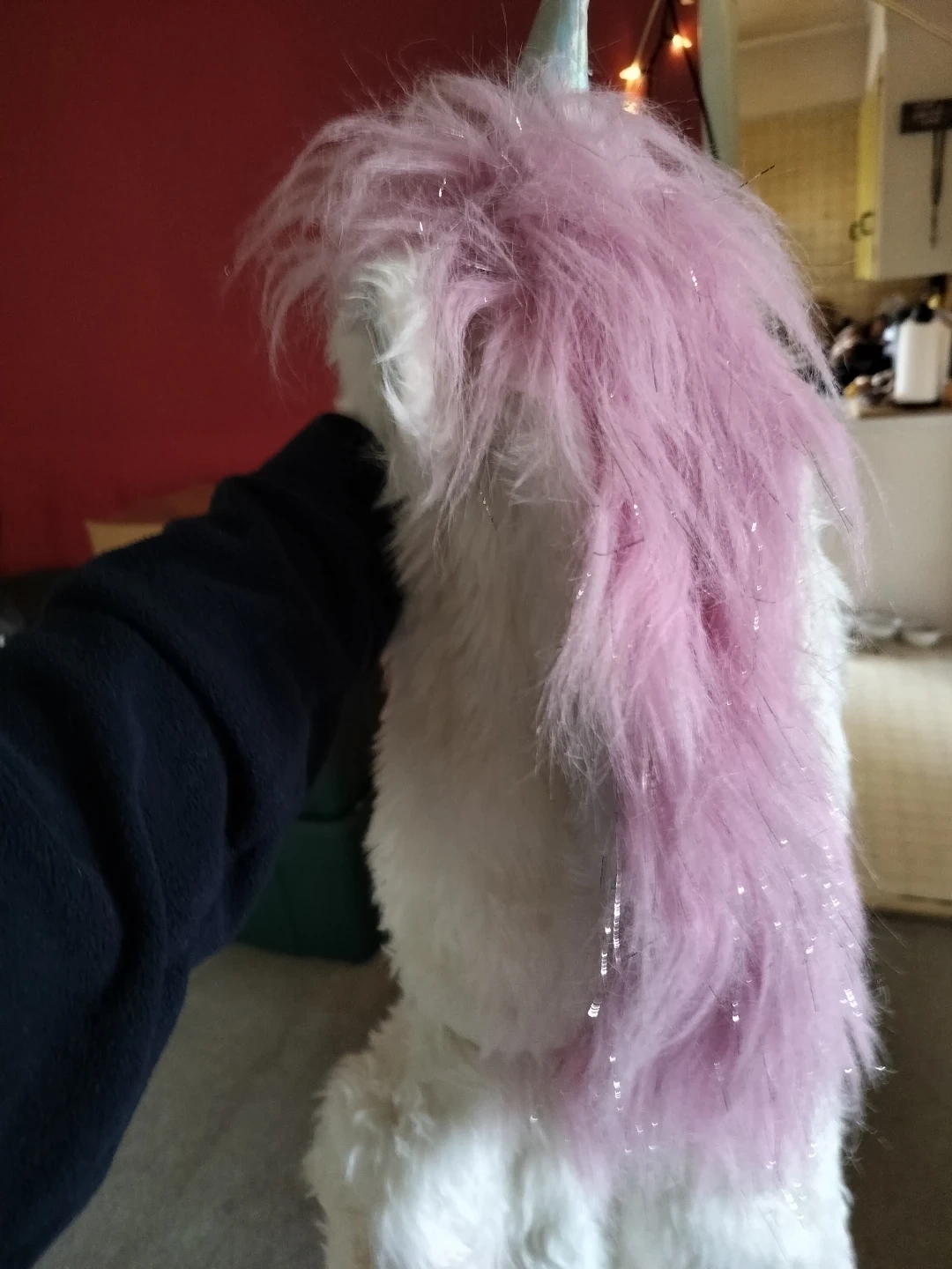 This fun hooded vest is white and furry, with a pastel pink mane and iridescent horn. It's perfect for dress-up or a costume party. The vest is soft and plush to the touch, has pockets, & is in great condition!! Includes clip on tail, leg covers, paw covers & sparkly wand. Adult size med.