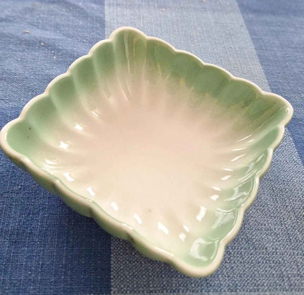 This is a small, decorative dish with a scalloped edge. It's perfect for holding small items like jewelry or keys. Made of ceramic.