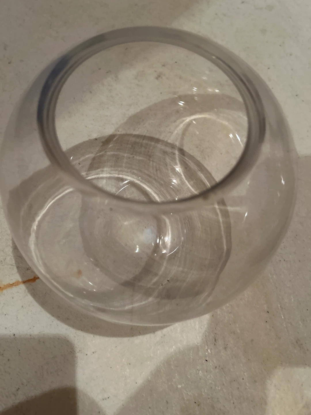 This clear glass fish bowl has a rounded shape. It's made of glass and can be used for small plants or as a decorative piece. It's a versatile item for any home!