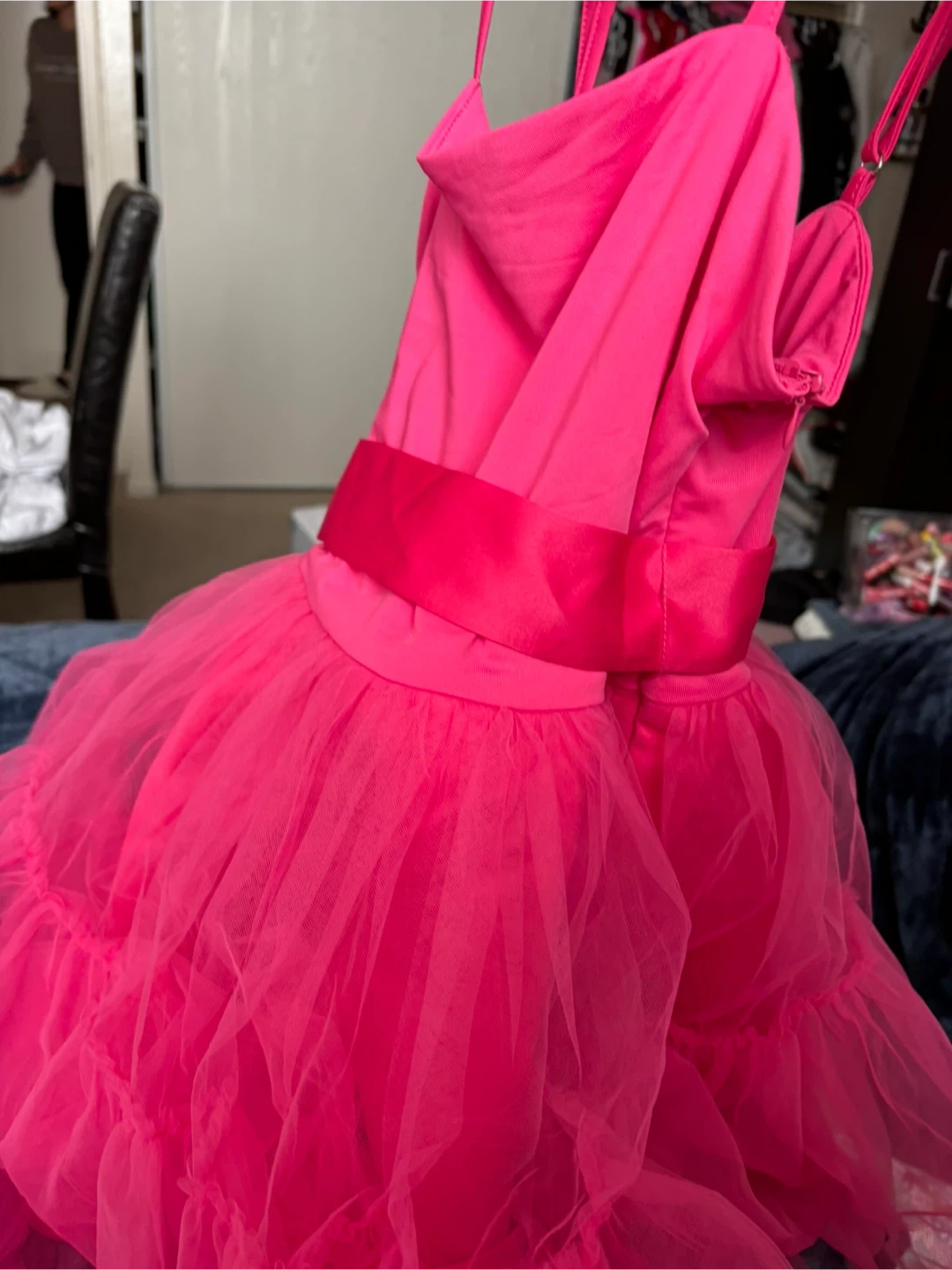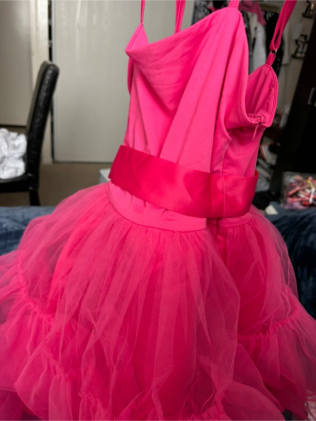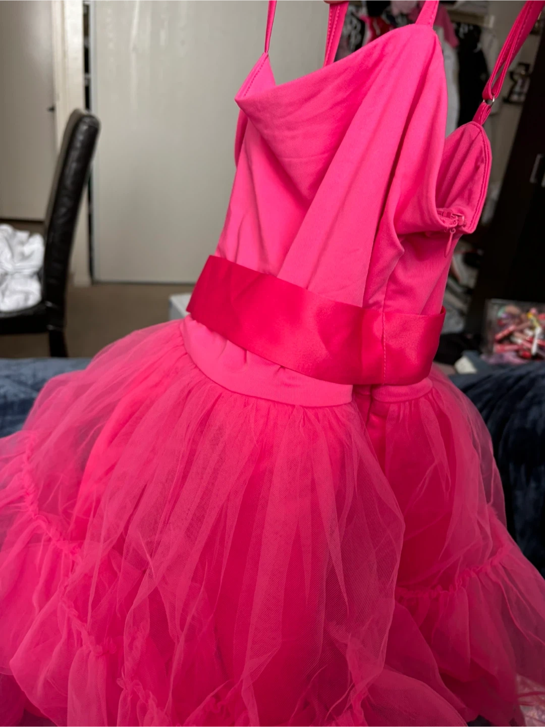This adorable dress is a vibrant hot pink, perfect for special occasions! It features a stretchy bodice and a full, fluffy tulle skirt that's sure to twirl. A satin ribbon sash cinches the waist for a sweet finish. It's a fun and festive choice for parties or performances!