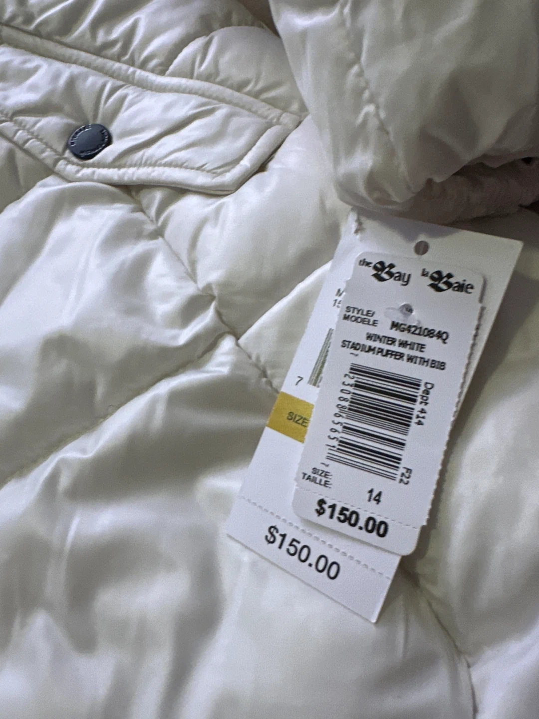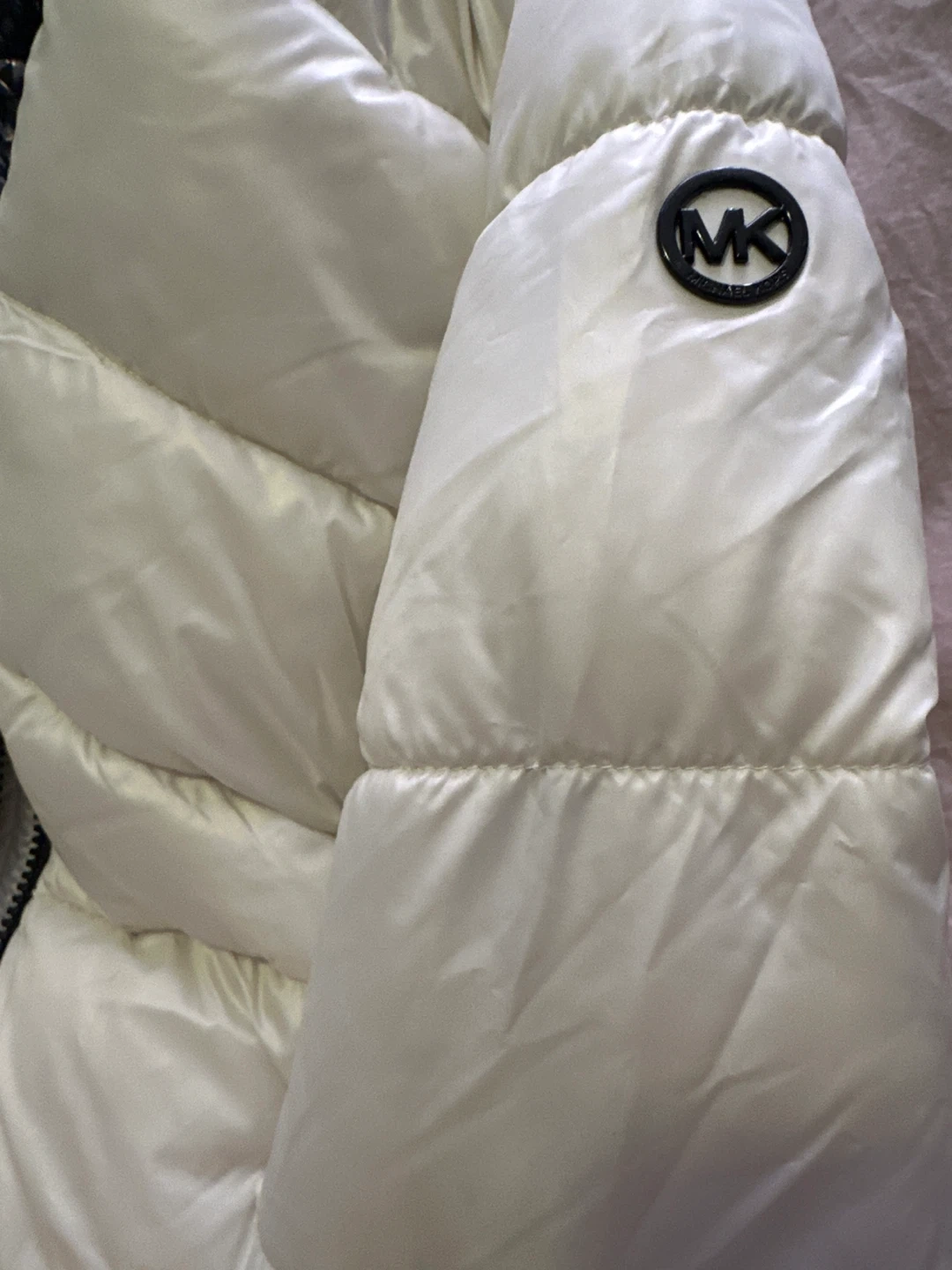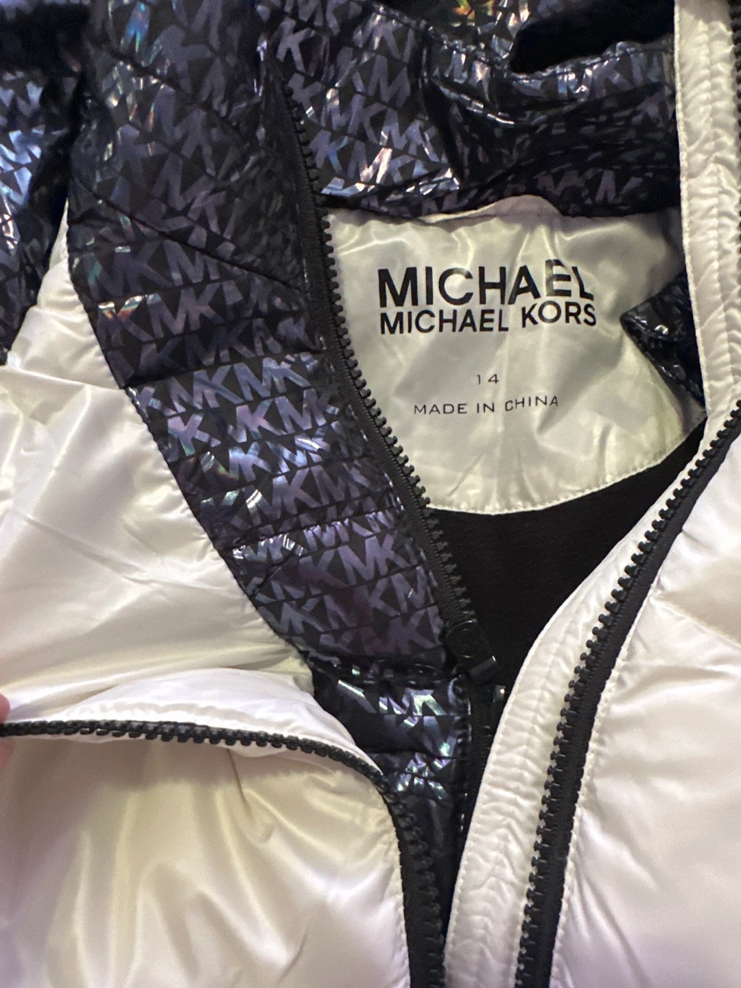This is a Michael Kors Winter Stadium Puffer Jacket. It's white with a shiny, patterned lining inside the hood. Size is for 14 years old girl